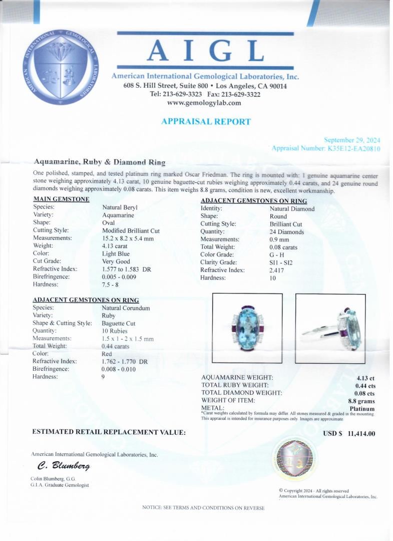 One polished, stamped, and tested platinum ring marked Oscar Friedman. The ring is mounted with: 1 genuine aquamarine center stone weighing approximately 4.13 carat, 10 genuine baguette-cut rubies weighing approximately 0.44 carats, and 24 genuine round diamonds weighing approximately 0.08 carats. This item weighs 8.8 grams, condition is new, excellent workmanship. #MAIN GEMSTONE# Species: Natural Beryl; Variety: Aquamarine; Shape: Oval; Cutting Style: Modified Brilliant Cut; Measurements: 15.2 x 8.2 x 5.4mm; Weight: 4.13 carat; Color: Light Blue; Cut Grade: Very Good; Refractive Index: 1.577 to 1.583 DR; Birefringence: 0.005 - 0.009; Hardness: 7.5 - 8 #ADJACENT GEMSTONES ON RING# Identity: Natural Diamond; Shape: Round; Cutting Style: Brilliant Cut; Quantity: 24 Diamonds; Measurements: 0.9mm; Total Weight: 0.08 carats; Color Grade: G-H; Clarity Grade: SI1-SI2; Refractive Index: 2.417; Hardness: 10 #ADJACENT GEMSTONES ON RING# Species: Natural Corundum; Variety: Ruby; Shape & Cutting Style: Baguette Cut; Quantity: 10 Rubies; Measurements: 1.5 x 1 - 2 x 1.5mm; Total Weight: 0.44 carats; Color: Red; Refractive Index: 1.762 - 1.770 DR; Birefringence: 0.008 - 0.010; Hardness: 9; AQUAMARINE WEIGHT: 4.13 ct; TOTAL RUBY WEIGHT: 0.44 cts; TOTAL DIAMOND WEIGHT: 0.08 cts; WEIGHT OF ITEM: 8.8 grams; METAL: Platinum #Size: 7