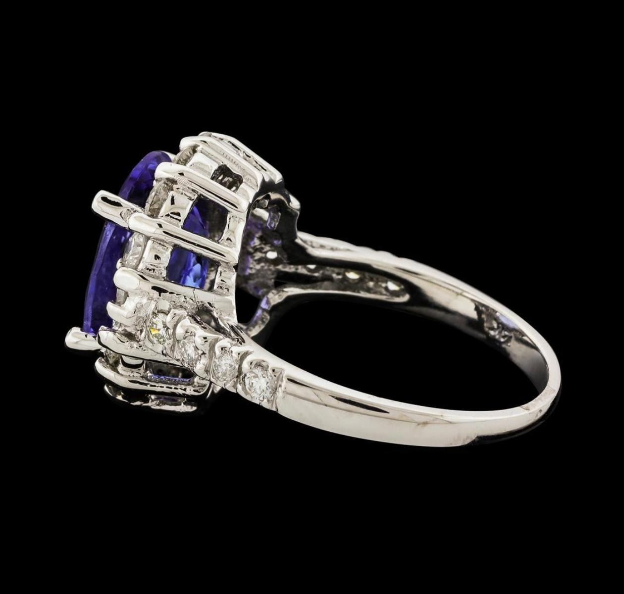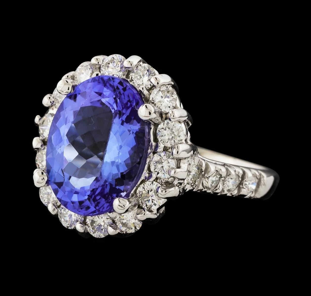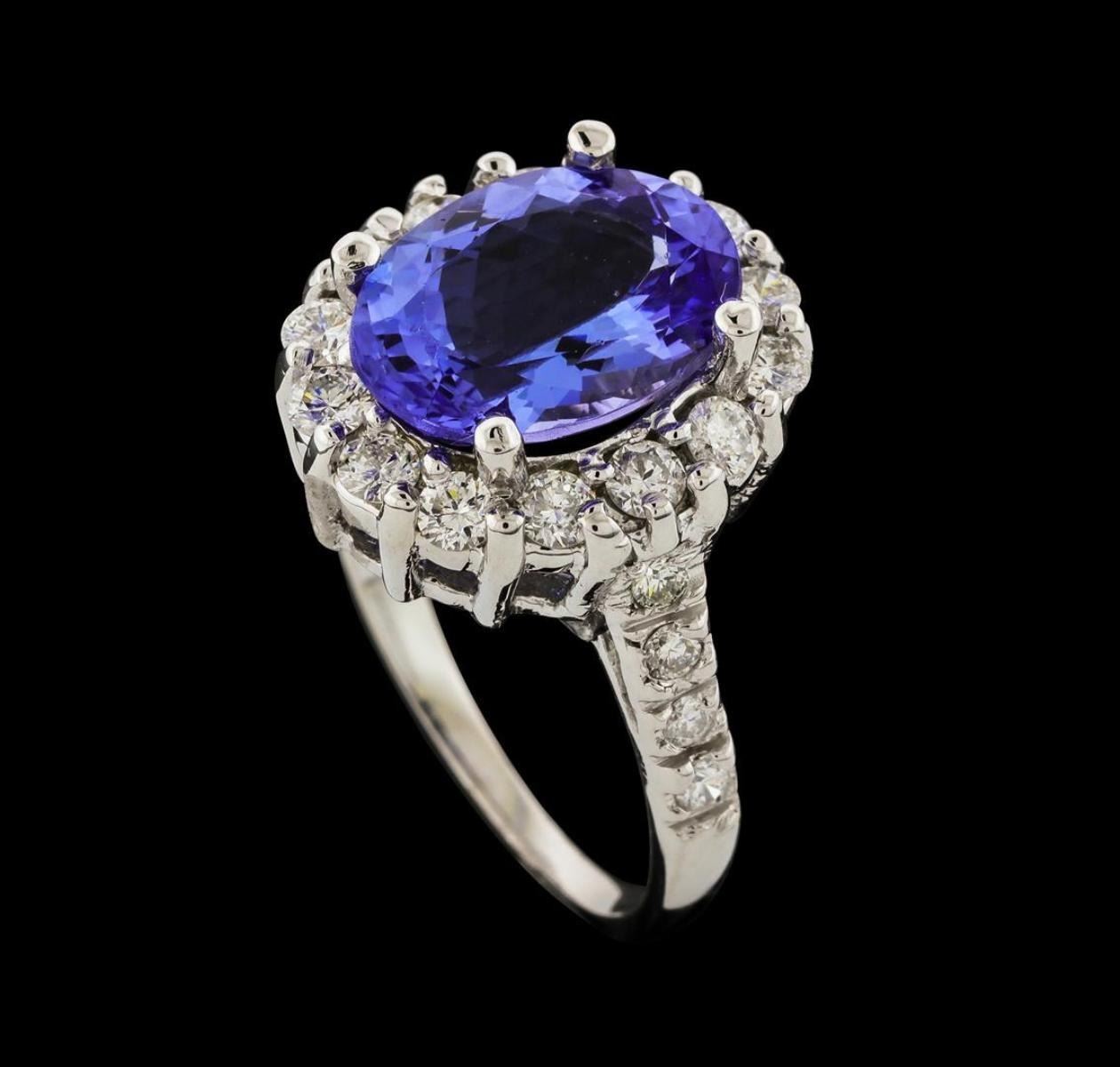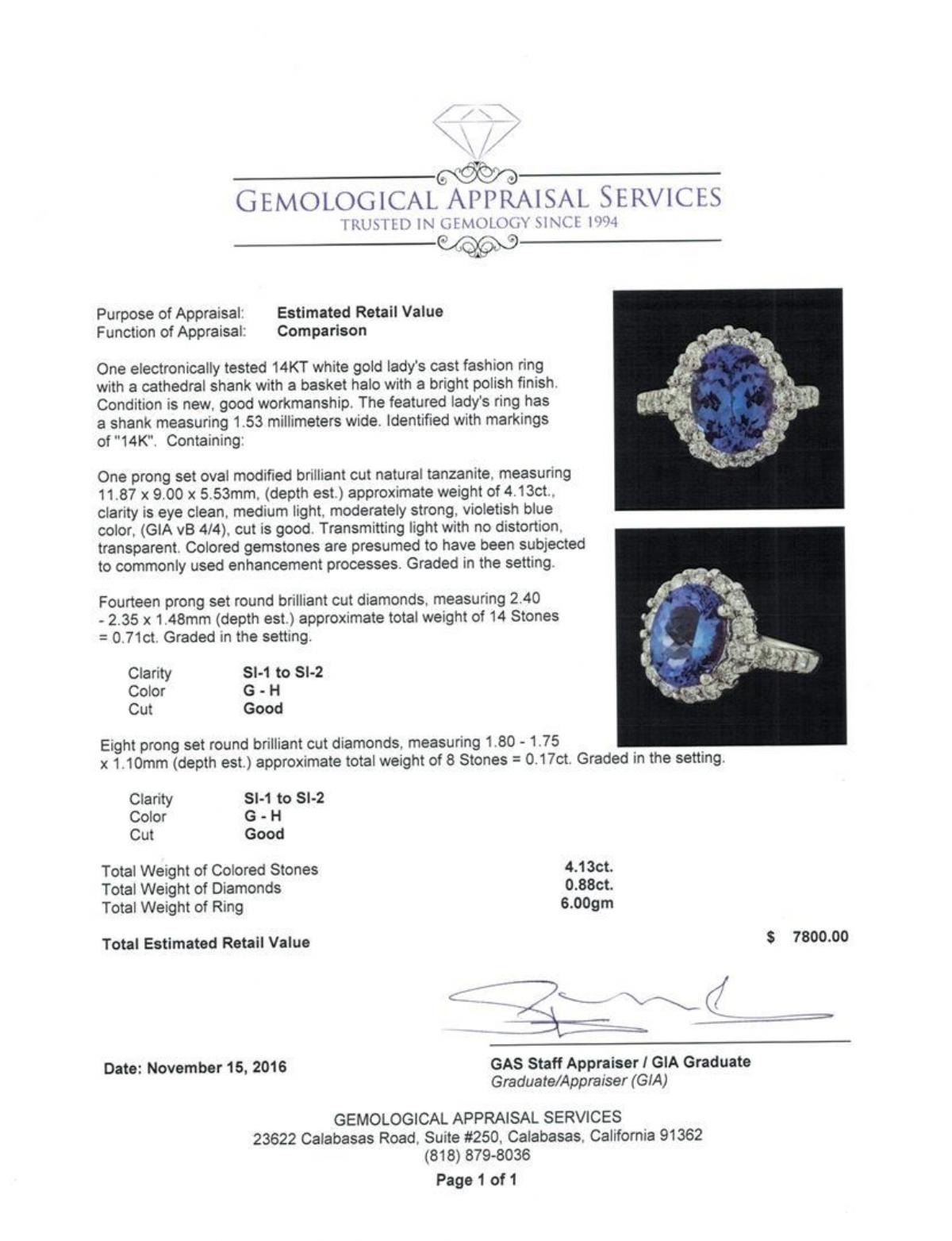 One electronically tested 14KT white gold lady's cast fashion ring with a cathedral shank with a basket halo with a bright polish finish. The featured lady's ring has a shank measuring 1.53 millimeters wide. Identified with markings of '14K'. Condition is new, good workmanship. Containing: One prong set oval modified brilliant cut natural tanzanite, measuring 11.87 x 9.00 x 5.53mm, (depth est.) approximate weight of 4.13ct., clarity is eye clean, medium light, moderately strong, violetish blue color, (GIA vB 4/4), cut is good. Transmitting light with no distortion, transparent. Colored gemstones are presumed to have been subjected to commonly used enhancement processes. Graded in the setting. Fourteen prong set round brilliant cut diamonds, measuring 2.40 - 2.35 x 1.48mm (depth est.) approximate total weight of 14 Stones = 0.71ct. Graded in the setting. Clarity SI-1 to SI-2. Color: G - H Cut Good Eight prong set round brilliant cut diamonds, measuring 1.80 - 1.75 x 1.10mm (depth est.) approximate total weight of 8 Stones = 0.17ct. Graded in the setting. Clarity SI-1 to SI-2. Color: G - H Cut Good. Total Weight of Colored Stones 4.13ct.. Total Weight of Diamonds 0.88ct.. Total Weight of Ring 6.00gm. GAS Appraised.