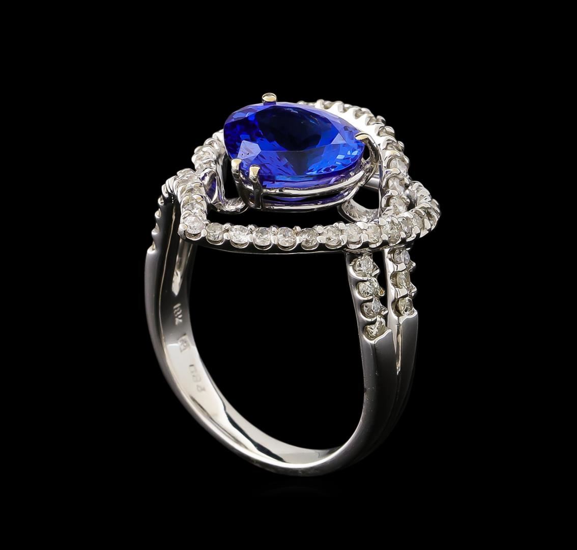 One electronically tested 18KT white gold ladies cast tanzanite and diamond ring with a bright polish finish. The featured tanzanite is set within intertwining diamond ribbons forming a stylized heart design supported by diamond set split shoulders, completed by a grooved two and one-half millimeter wide band. Identified with markings of "18K". Condition is new, good workmanship. Containing: One prong set pear mixed cut natural tanzanite, measuring 9.70 x 10.00 x 6.00mm, 6%. bulge factor, approximate weight of 4.13ct., clarity is eye clean, type I, medium dark, very slightly grayish, violetish blue color, (GIA vB 6/3), cut is good. Transmitting light with no distortion, transparent. Graded in the setting. Tanzanite is a very rare gemstone that is only found in the country of Tanzania. Originally discovered in 1967. Tiffany & Company, named the stone Tanzanite. It is found in the Usumburu Mountains that border the Umba Valley of northern Tanzania. Tanzanite occurs in gray, brown, violet, blue, reddish-purple, & green. The gem is interesting because of its exceptional pleochroism. Rotated in different directions a tanzanite will exhibit multiple changes of color. Tanzanite has a low tolerance to ultrasonic cleaning, and should not be cleaned using this method. Sixty-Three prong set round brilliant cut diamonds, measuring 1.60 - 1.50 x 0.93mm (depth est.) approximate total weight of 63 Stones = 0.88ct. Graded in the setting. Clarity: I-2 to I-3. Color: H - J. Total Weight of Colored Stones 4.13ct. Total Weight of Diamonds 0.88ct. Total Weight of Ring 6.89gm. AIG Appraised at $12,090.00.
