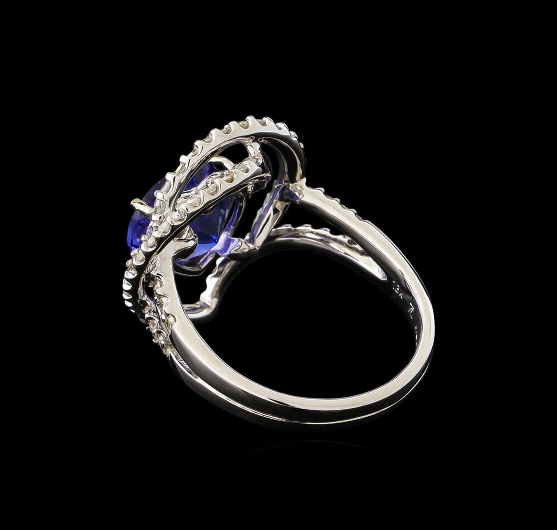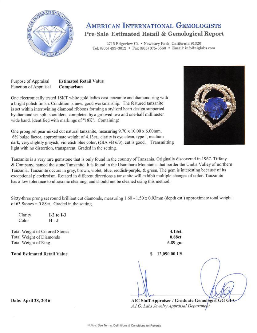 One electronically tested 18KT white gold ladies cast tanzanite and diamond ring with a bright polish finish. The featured tanzanite is set within intertwining diamond ribbons forming a stylized heart design supported by diamond set split shoulders, completed by a grooved two and one-half millimeter wide band. Identified with markings of "18K". Condition is new, good workmanship. Containing: One prong set pear mixed cut natural tanzanite, measuring 9.70 x 10.00 x 6.00mm, 6%. bulge factor, approximate weight of 4.13ct., clarity is eye clean, type I, medium dark, very slightly grayish, violetish blue color, (GIA vB 6/3), cut is good. Transmitting light with no distortion, transparent. Graded in the setting. Tanzanite is a very rare gemstone that is only found in the country of Tanzania. Originally discovered in 1967. Tiffany & Company, named the stone Tanzanite. It is found in the Usumburu Mountains that border the Umba Valley of northern Tanzania. Tanzanite occurs in gray, brown, violet, blue, reddish-purple, & green. The gem is interesting because of its exceptional pleochroism. Rotated in different directions a tanzanite will exhibit multiple changes of color. Tanzanite has a low tolerance to ultrasonic cleaning, and should not be cleaned using this method. Sixty-Three prong set round brilliant cut diamonds, measuring 1.60 - 1.50 x 0.93mm (depth est.) approximate total weight of 63 Stones = 0.88ct. Graded in the setting. Clarity: I-2 to I-3. Color: H - J. Total Weight of Colored Stones 4.13ct. Total Weight of Diamonds 0.88ct. Total Weight of Ring 6.89gm. AIG Appraised at $12,090.00.