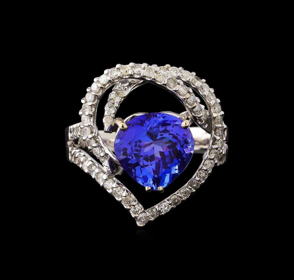 One electronically tested 18KT white gold ladies cast tanzanite and diamond ring with a bright polish finish. The featured tanzanite is set within intertwining diamond ribbons forming a stylized heart design supported by diamond set split shoulders, completed by a grooved two and one-half millimeter wide band. Identified with markings of "18K". Condition is new, good workmanship. Containing: One prong set pear mixed cut natural tanzanite, measuring 9.70 x 10.00 x 6.00mm, 6%. bulge factor, approximate weight of 4.13ct., clarity is eye clean, type I, medium dark, very slightly grayish, violetish blue color, (GIA vB 6/3), cut is good. Transmitting light with no distortion, transparent. Graded in the setting. Tanzanite is a very rare gemstone that is only found in the country of Tanzania. Originally discovered in 1967. Tiffany & Company, named the stone Tanzanite. It is found in the Usumburu Mountains that border the Umba Valley of northern Tanzania. Tanzanite occurs in gray, brown, violet, blue, reddish-purple, & green. The gem is interesting because of its exceptional pleochroism. Rotated in different directions a tanzanite will exhibit multiple changes of color. Tanzanite has a low tolerance to ultrasonic cleaning, and should not be cleaned using this method. Sixty-Three prong set round brilliant cut diamonds, measuring 1.60 - 1.50 x 0.93mm (depth est.) approximate total weight of 63 Stones = 0.88ct. Graded in the setting. Clarity: I-2 to I-3. Color: H - J. Total Weight of Colored Stones 4.13ct. Total Weight of Diamonds 0.88ct. Total Weight of Ring 6.89gm. AIG Appraised at $12,090.00.