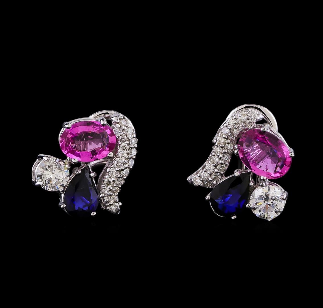 One pair electronically tested 14KT white gold lady's combination cast & assembled freeform earrings with Omega clip backs with posts with a bright polish finish. Identified with markings of "14K". Condition is new, good workmanship. Containing: Two prong set oval modified brilliant cut natural pink sapphires, measuring 8.05 x 5.85 x 2.90mm, (depth est.) approximate total weight of 2.52ct., clarity is eye clean, medium light, moderately strong, slightly purplish red color, (GIA slpR 4/4), cut is good. Transmitting light with no distortion, transparent. Colored gemstones are presumed to have been subjected to commonly used enhancement processes. Graded in the setting. Two prong set pear modified brilliant cut natural blue sapphires, measuring 7.10 x 5.10 x 2.50mm, (depth est.) 3%. bulge factor, approximate total weight of 1.62ct., clarity is slightly included, medium dark, strong, blue color, (GIA B 6/5), cut is very good. Transmitting light with no distortion, transparent. Colored gemstones are presumed to have been subjected to commonly used enhancement processes. Graded in the setting. Two prong set round brilliant cut diamonds, measuring 5.05 - 4.95 x 3.10mm (depth est.) approximate total weight of 2 Stones = 0.98ct. Graded in the setting. Clarity: SI-1 to SI-2. Color: H - I. Cut Good Thirty-Eight prong set round brilliant cut diamonds, measuring 1.40 - 1.35 x 0.86mm (depth est.) approximate total weight of 38 Stones = 0.40ct. Graded in the setting. Clarity: SI to SI-2. Color: G - Good. Total Weight of Colored Stones 4.14ct. Total Weight of Diamonds 1.38ct. Total Weight of Earrings 5.70gm. GAS Appraised.