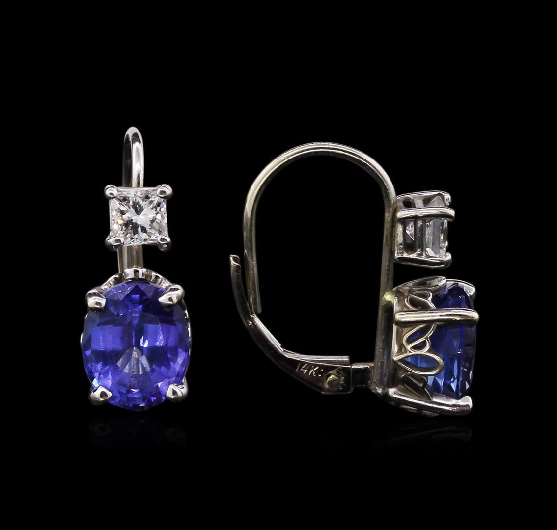One electronically tested 14KT white gold ladies cast & assembled tanzanite and diamond dangle earrings with lever backs. Condition is good. Bright polish finish. Identified with markings of "14K". Containing: Two prong set oval mixed cut natural tanzanites, measuring 8.10 x 7.10 x 5.00mm, approximate total weight of 4.14ct., clarity is eye clean, type I, medium dark, very slightly grayish, bluish color, (GIA bV 6/3), cut is good. Transmitting light with no distortion, transparent. Measurements & the color grade are an average for the pair. Graded in the setting. Tanzanite is a very rare gemstone that is only found in the country of Tanzania. Originally discovered in 1967. Tiffany & Company, named the stone Tanzanite. It is found in the Usumburu Mountains that border the Umba Valley of northern Tanzania. Tanzanite occurs in gray, brown, violet, blue, reddish-purple, & green. The gem is interesting because of its exceptional pleochroism. Rotated in different directions a tanzanite will exhibit multiple changes of color. Tanzanite has a low tolerance to ultrasonic cleaning, and should not be cleaned using this method. Two prong set princess cut diamonds, measuring 3.60 x 3.50 x 2.63mm (depth est.) approximate total weight of 2 stones = 0.64ct. Graded in the setting. Clarity: VS-1. Color: F. Total Weight of Colored Stones: 4.14ct. Total Weight of Diamonds: 0.64ct. Total Weight of Earrings: 3.63 grams. AIG Appraised at $9,190.00.