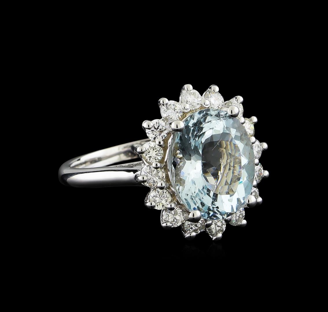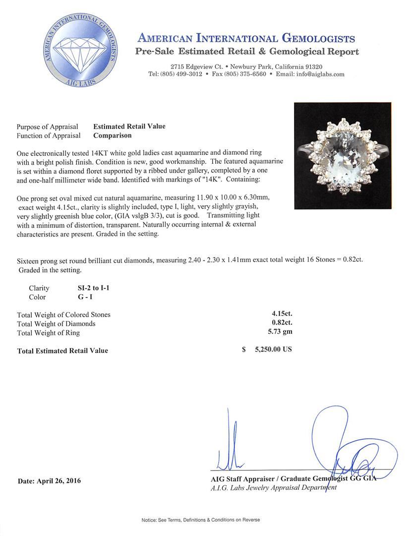 One electronically tested 14KT white gold ladies cast aquamarine and diamond ring with a bright polish finish. The featured aquamarine is set within a diamond floret supported by a ribbed under gallery, completed by a one and one-half millimeter wide band. Identified with markings of "14K". Condition is new, good workmanship. Containing: One prong set oval mixed cut natural aquamarine, measuring 11.90 x 10.00 x 6.30mm, exact weight 4.15ct., clarity is slightly included, type I, light, very slightly grayish, very slightly greenish blue color, (GIA vslgB 3/3), cut is good. Transmitting light with a minimum of distortion, transparent. Naturally occurring internal & external characteristics are present. Graded in the setting. Sixteen prong set round brilliant cut diamonds, measuring 2.40 - 2.30 x 1.41mm exact total weight 16 Stones = 0.82ct. Graded in the setting. Clarity: SI-2 to I-1. Color: G - I. Total Weight of Colored Stones 4.15ct. Total Weight of Diamonds 0.82ct. Total Weight of Ring 5.73gm. AIG Appraised at $5,250.00.