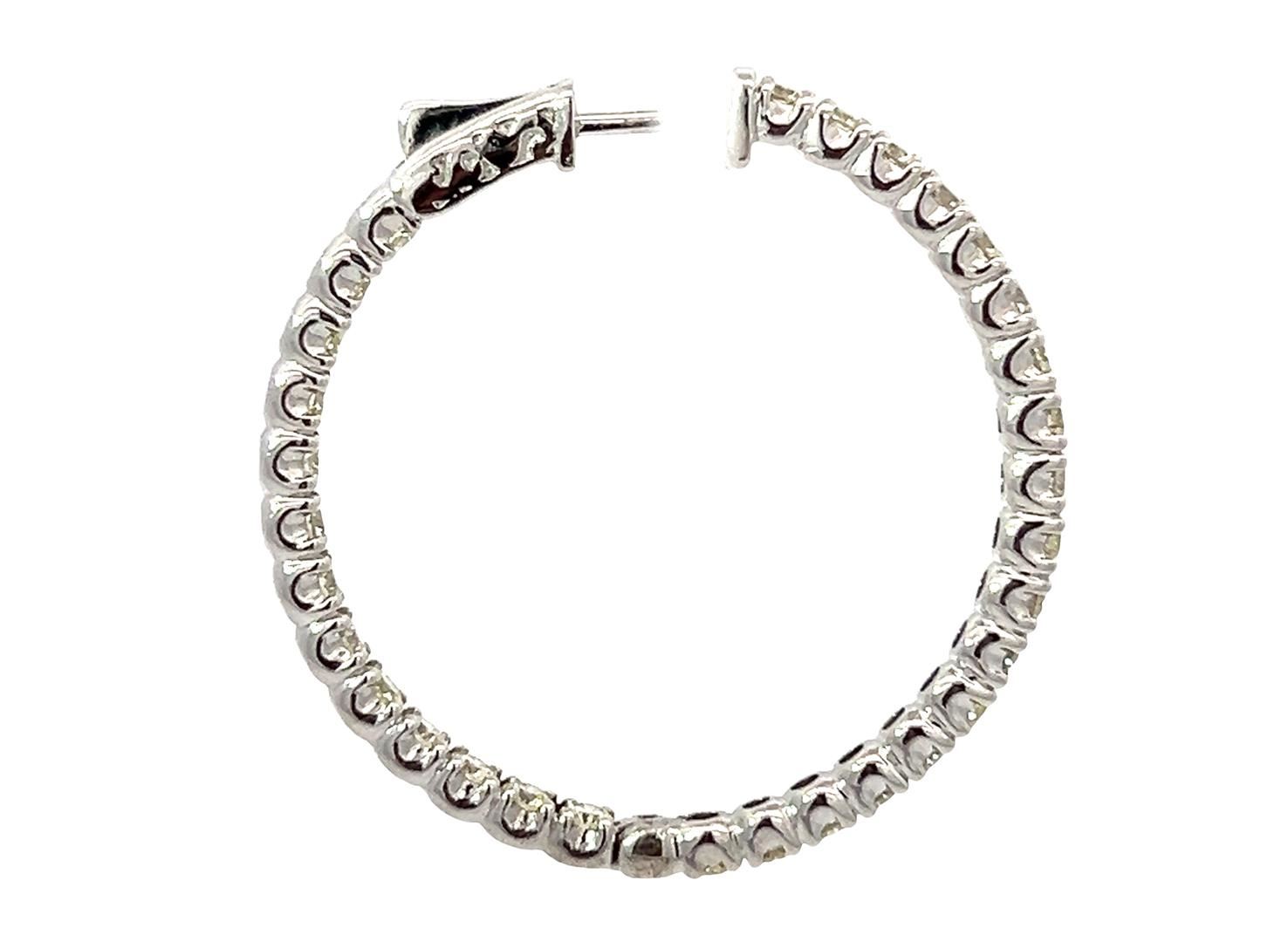 One pair electronically tested 14KT white gold lady's combination cast & assembled fashion inside-out hoop earrings with hinged, snap locking posts with a bright polish finish. The featured hoop earring has a diameter of 36.00 millimeter. Identified with markings of "14K". Condition is new, good workmanship.Containing: Sixty-Two prong set round brilliant cut diamonds, measuring 2.60 - 2.45 x 1.62mm (depth est.) approximate total weight of 62 Stones = 4.15ct. Graded in the setting.Color I - JClarity VS-2 to SI-1 Cut Very Good Total Weight of Diamonds 4.15ct. Total Weight of Earrings 12.40gm Estimated Retail Value 14150