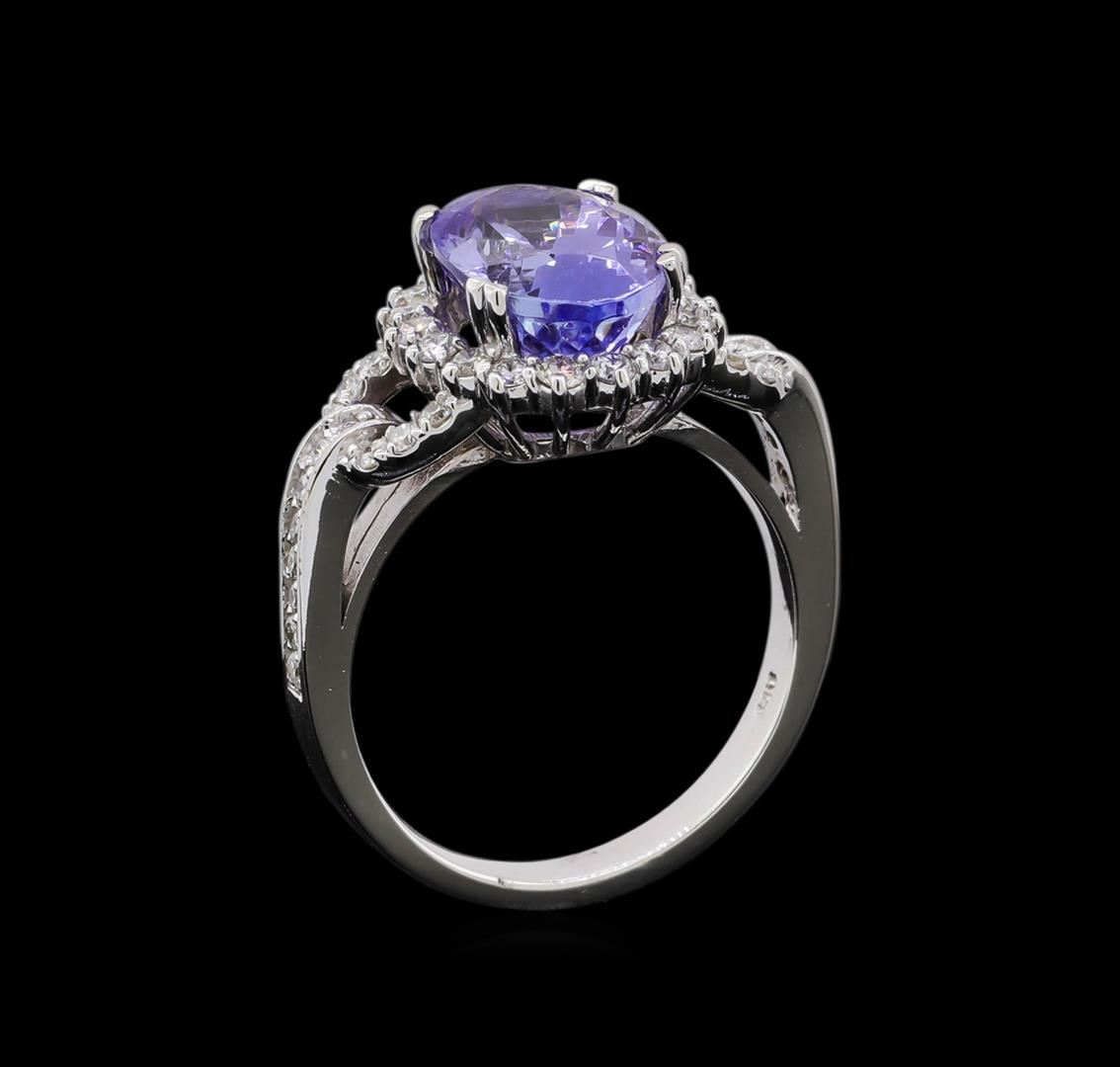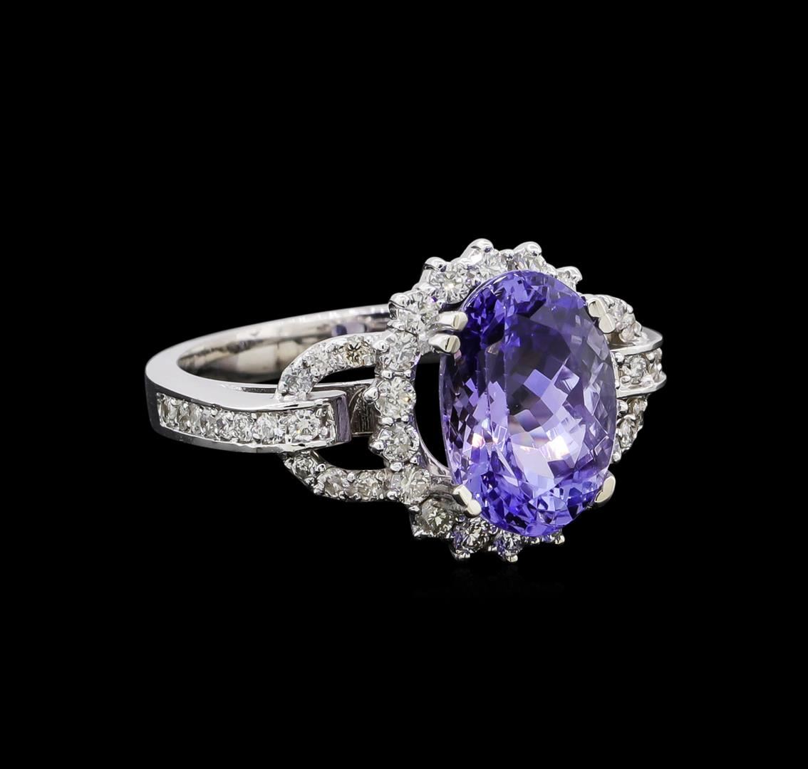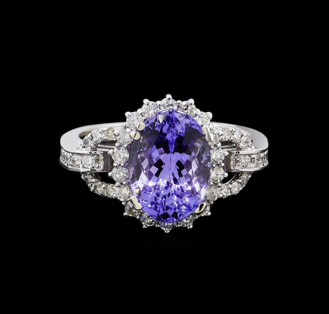 One electronically tested 14KT white gold lady's cast fashion ring with a cathedral shank basket halo with a bright polish finish. The featured lady's ring has a shank measuring 2.69 millimeters in width. Identified with markings of 'K14'. Condition is new, good workmanship. Containing: One prong set oval modified brilliant cut natural tanzanite, measuring 11.38 x 8.35 x 6.45mm, (depth est.) approximate weight of 4.15ct., clarity is eye clean, medium light, moderately strong, violetish blue color, (GIA vB 4/4), cut is very good. Transmitting light with no distortion, transparent. Colored gemstones are presumed to have been subjected to commonly used enhancement processes. Graded in the setting. Twenty-Eight prong set round brilliant cut diamonds, measuring 1.40 - 1.35 x 0.86mm (depth est.) approximate total weight of 28 Stones = 0.28ct. Graded in the setting. Clarity SI-1 to SI-2. Color: H - I Cut Good Eighteen prong set round brilliant cut diamonds, measuring 1.85 - 1.80 x 1.10mm (depth est.) approximate total weight of 18 Stones = 0.40ct. Graded in the setting. Clarity SI-1 to SI-2. Color: H - I Cut Good. Total Weight of Colored Stones 4.15ct.. Total Weight of Diamonds 0.68ct.. Total Weight of Ring 5.80gm. GAS Appraised at $8,160.00.