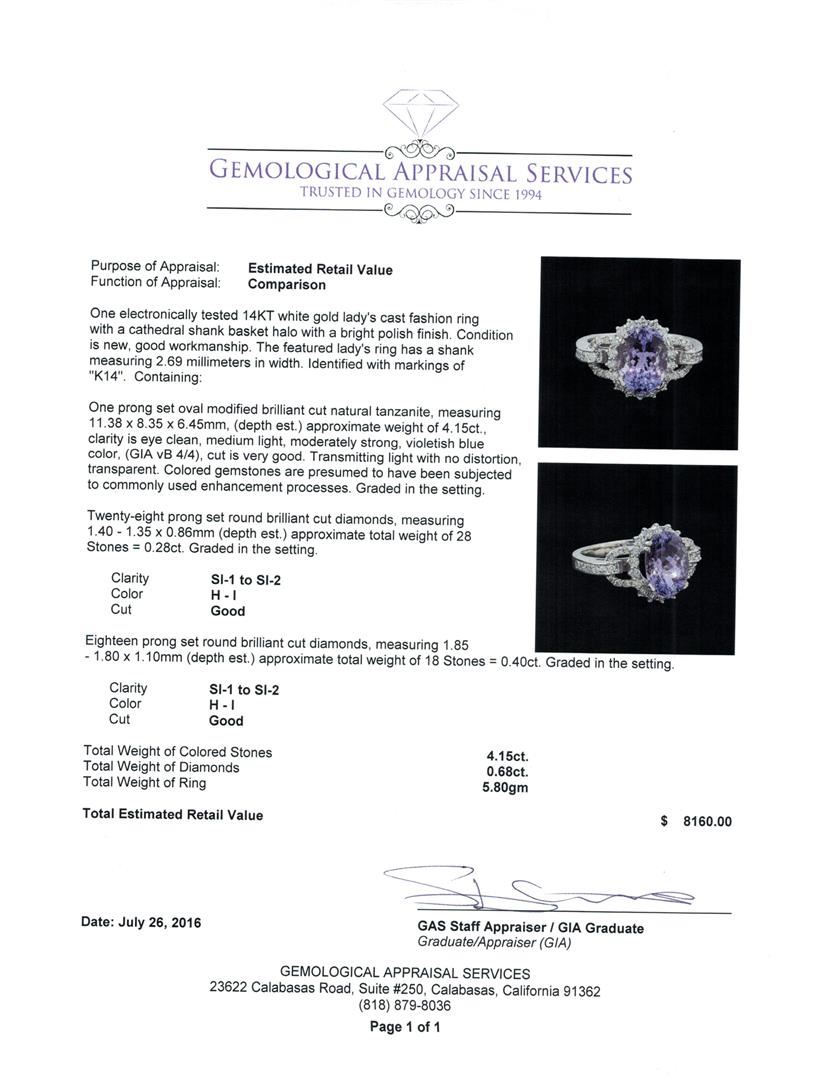 One electronically tested 14KT white gold lady's cast fashion ring with a cathedral shank basket halo with a bright polish finish. The featured lady's ring has a shank measuring 2.69 millimeters in width. Identified with markings of 'K14'. Condition is new, good workmanship. Containing: One prong set oval modified brilliant cut natural tanzanite, measuring 11.38 x 8.35 x 6.45mm, (depth est.) approximate weight of 4.15ct., clarity is eye clean, medium light, moderately strong, violetish blue color, (GIA vB 4/4), cut is very good. Transmitting light with no distortion, transparent. Colored gemstones are presumed to have been subjected to commonly used enhancement processes. Graded in the setting. Twenty-Eight prong set round brilliant cut diamonds, measuring 1.40 - 1.35 x 0.86mm (depth est.) approximate total weight of 28 Stones = 0.28ct. Graded in the setting. Clarity SI-1 to SI-2. Color: H - I Cut Good Eighteen prong set round brilliant cut diamonds, measuring 1.85 - 1.80 x 1.10mm (depth est.) approximate total weight of 18 Stones = 0.40ct. Graded in the setting. Clarity SI-1 to SI-2. Color: H - I Cut Good. Total Weight of Colored Stones 4.15ct.. Total Weight of Diamonds 0.68ct.. Total Weight of Ring 5.80gm. GAS Appraised at $8,160.00.