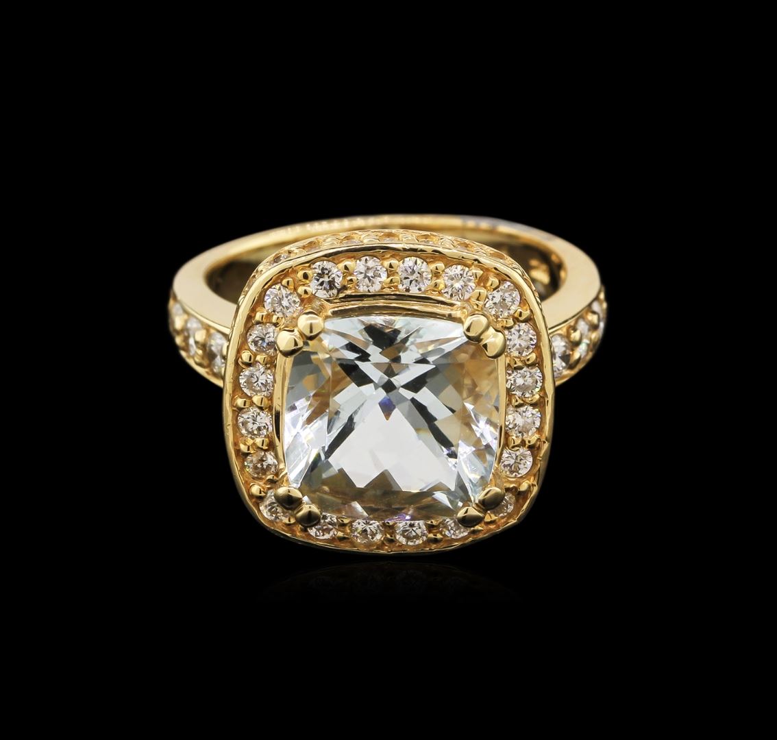 One electronically tested 14KT yellow gold ladies cast aquamarine and diamond ring with a bright polish finish. Identified with markings of "14K". Condition is new. Containing: One prong set square cushion modified brilliant cut natural aquamarine, measuring 10.00 x 10.00 x 6.50mm, approximate weight of 4.15ct., clarity is eye clean, type I, light, slightly grayish, blue color, (GIA B 3/2), cut is very good. Fifty-Four prong set round brilliant cut diamonds, measuring 1.70 - 1.70 x 1.02mm (depth est.) approximate total weight of 54 Stones = 1.09ct. Clarity: SI-1 to I-1. Color: I - J, Cut is Good. Colored gemstones are presumed to have been subjected to commonly used enhancement processes. All diamonds and colored gemstones are graded in the mounting, unless otherwise stated. Total Weight of Colored Stones 4.15ct. Total Weight of Diamonds 1.09ct. Total Weight of Ring 9.40 grams. GGL Appraised at $4,165.00.