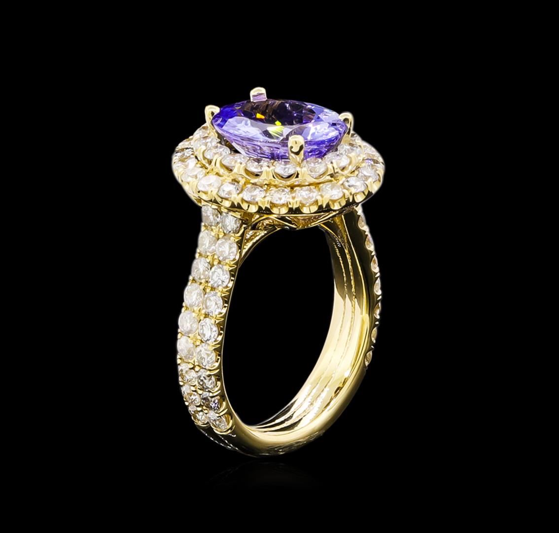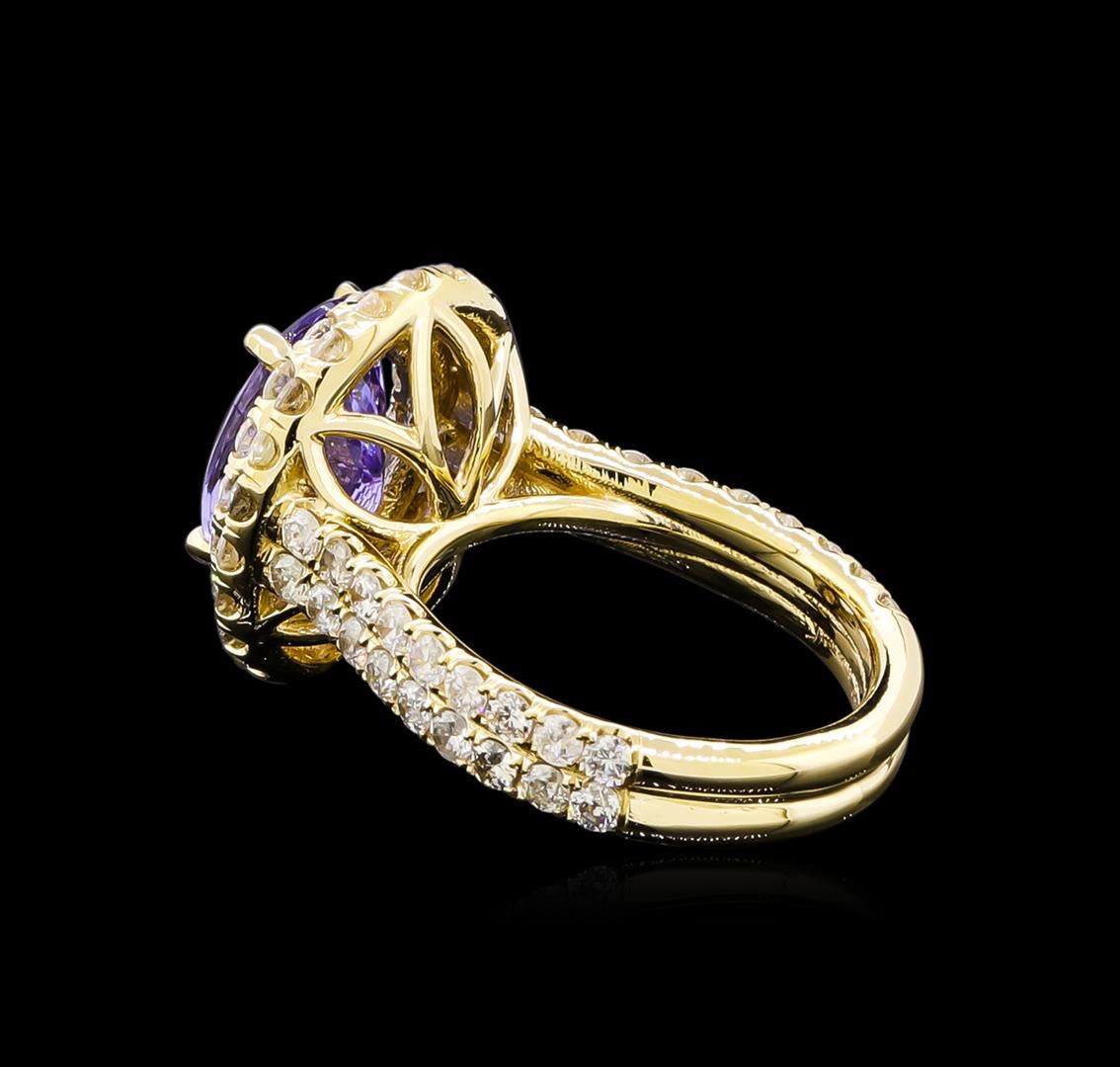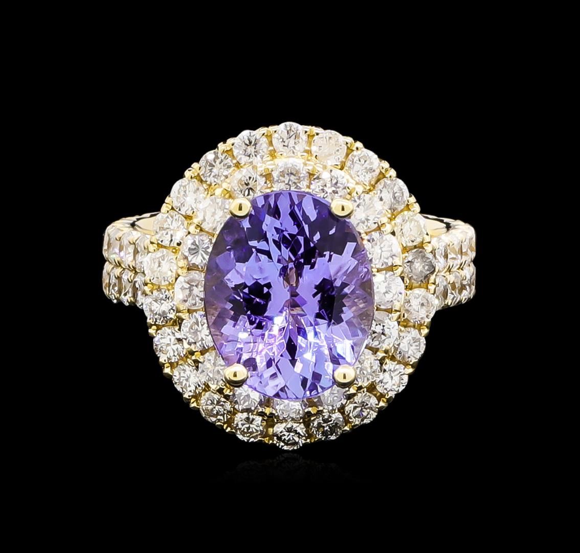 One electronically tested 14KT yellow gold ladies cast tanzanite and diamond ring with a bright polish finish. The featured tanzanite is set within tiered diamond bezels supported by a tuliped under gallery and diamond ribbon shoulders, completed by a four millimeter wide band. Condition is new, good workmanship. Containing: One prong set oval mixed cut natural tanzanite, measuring 10.90 x 8.90 x 5.79mm, 5%. bulge factor, approximate weight of 4.15ct., clarity is slightly included, type I, medium, very slightly grayish, violet color, (GIA V 5/3), cut is good. Transmitting light with a minimum of distortion, transparent. Naturally occurring internal & external characteristics are present. Graded in the setting. Tanzanite is a very rare gemstone that is only found in the country of Tanzania. Originally discovered in 1967. Tiffany & Company, named the stone Tanzanite. It is found in the Usumburu Mountains that border the Umba Valley of northern Tanzania. Tanzanite occurs in gray, brown, violet, blue, reddish-purple, & green. The gem is interesting because of its exceptional pleochroism. Rotated in different directions a tanzanite will exhibit multiple changes of color. Tanzanite has a low tolerance to ultrasonic cleaning, and should not be cleaned using this method. Seventy-Four prong set round brilliant cut diamonds, measuring 2.00 - 1.90 x 1.17mm (depth est.) approximate total weight of 74 Stones = 2.10ct. Graded in the setting. Clarity: SI-2 to I-2. Color: G - I. Total Weight of Colored Stones 4.15ct. Total Weight of Diamonds 2.10ct. Total Weight of Ring 7.98gm. AIG Appraised at $12,405.00.