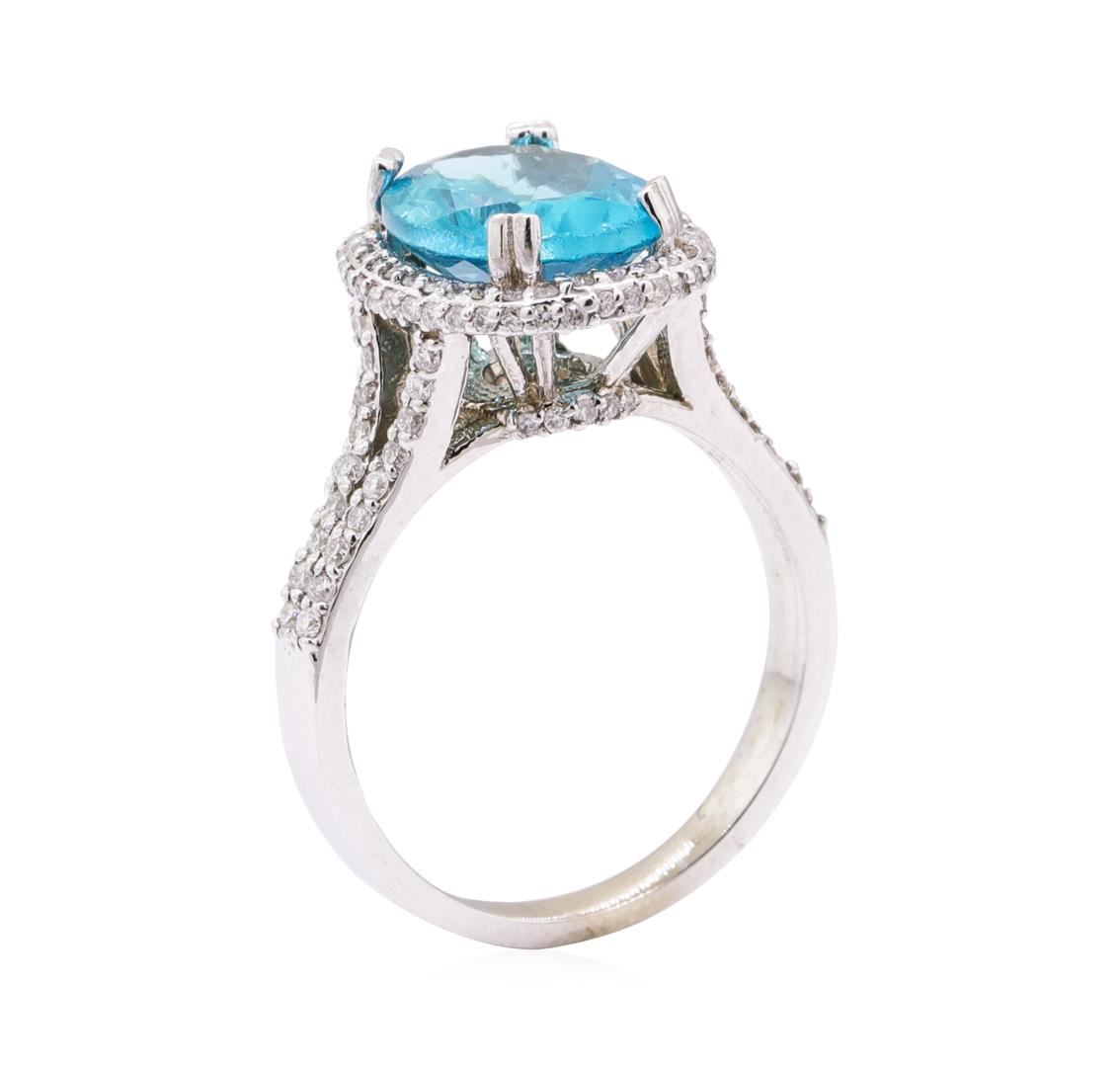 One electronically tested 14KT white gold lady's cast fashion ring with a split cathedral shank with a bright polish finish. The featured lady's ring has a shank measuring 2.30 millimeters wide. Identified with markings of 'K14'. Condition is new, good workmanship. Containing: One prong set oval modified mixed cut natural apatite, measuring 10.98 x 9.08 x 4.87mm, (depth est.) 10%. bulge factor, approximate weight of 3.62ct., clarity is slightly included, medium dark, strong, very slightly greenish blue color, (GIA vslgB 6/5), cut is good. Transmitting light with a minimum of distortion, transparent. Colored gemstones are presumed to have been subjected to commonly used enhancement processes. Graded in the setting. Thirty-Six prong set round brilliant cut diamonds, measuring 1.20 - 1.15 x 0.73mm (depth est.) approximate total weight of 36 Stones = 0.22ct. Graded in the setting. Color G - I Clarity SI-2 to I-1 Cut Good Eighty-Two prong set round brilliant cut diamonds, measuring 1.00 - 0.95 x 0.61mm (depth est.) approximate total weight of 82 Stones = 0.32ct. Graded in the setting. Color G - I Clarity SI-2 to I-1 Cut Good. Total Weight of Colored Stones 3.62ct.. Total Weight of Diamonds 0.54ct.. Total Weight of Ring 5.40gm GAS Appraised at $4005.00. GAS Appraised.