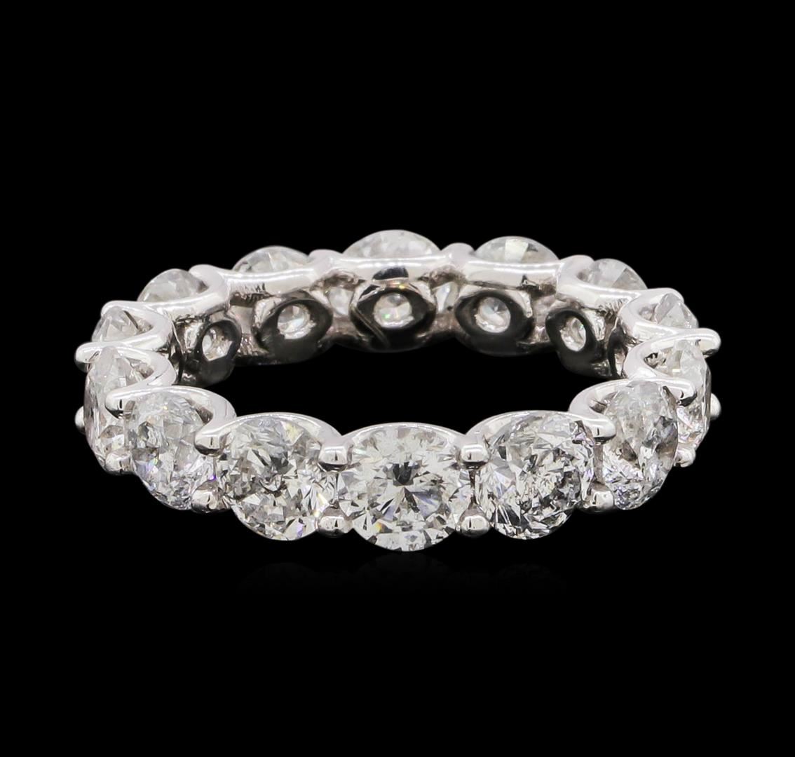 One electronically tested 14KT white gold ladies cast diamond eternity ring. The ring features a continuous four millimeter wide diamond ribbon. Bright polish finish. Ring size 5. Condition is new, good workmanship. Containing: Fourteen prong set round brilliant cut diamonds, measuring 4.40 - 4.20 x 2.58mm (depth est.) approximate total weight of 14 Stones = 4.17ct. Graded in the setting. Clarity I-1 to I-2. Color: G - I. Total Weight of Diamonds 4.17ct.. Total Weight of Ring 2.99gm. AIG Appraised at $12,010.00.