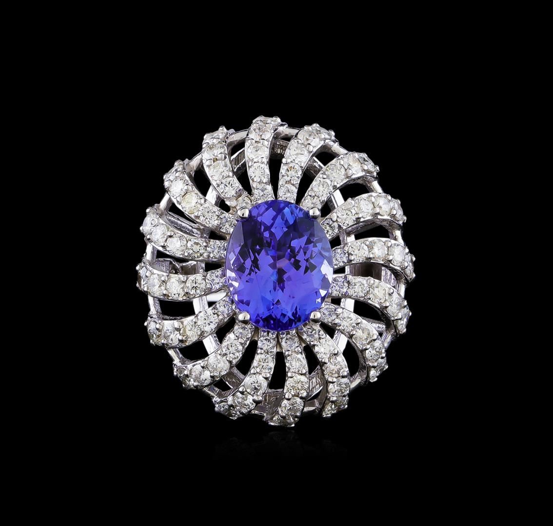 One electronically tested 14KT white gold lady's cast fashion ring with a basket halo with a bright polish finish. The featured lady's ring has a shank measuring 2.01 millimeters in width. Identified with markings of "K14". Condition is new, good workmanship. Containing: One prong set oval oval modified brilliant cut natural tanzanite, measuring 10.90 x 8.89 x 6.01mm, (depth est.) approximate weight of 4.17ct., clarity is eye clean, medium, moderately strong, violetish blue color, (GIA vB 5/4), cut is very good. Transmitting light with no distortion, transparent. Colored gemstones are presumed to have been subjected to commonly used enhancement processes. Graded in the setting. Sixteen prong set round brilliant cut diamonds, measuring 2.30 - 2.20 x 1.37mm (depth est.) approximate total weight of 16 Stones = 0.68ct. Graded in the setting. Clarity: SI-1 to SI-2. Color: H - I. Cut Good Forty-Eight prong set round brilliant cut diamonds, measuring 1.90 - 1.80 x 1.15mm (depth est.) approximate total weight of 48 Stones = 1.17ct. Graded in the setting. Clarity: SI-1 to SI-2. Color: H - I. Cut Good Sixteen prong set round brilliant cut diamonds, measuring 1.60 - 1.50 x 0.96mm (depth est.) approximate total weight of 16 Stones = 0.23ct. Graded in the setting. Clarity: SI-1 to SI-2. Color: G - Good. Total Weight of Colored Stones 4.17ct. Total Weight of Diamonds 2.08ct. Total Weight of Ring 9.70gm. GAS Appraised at $13,060.00.