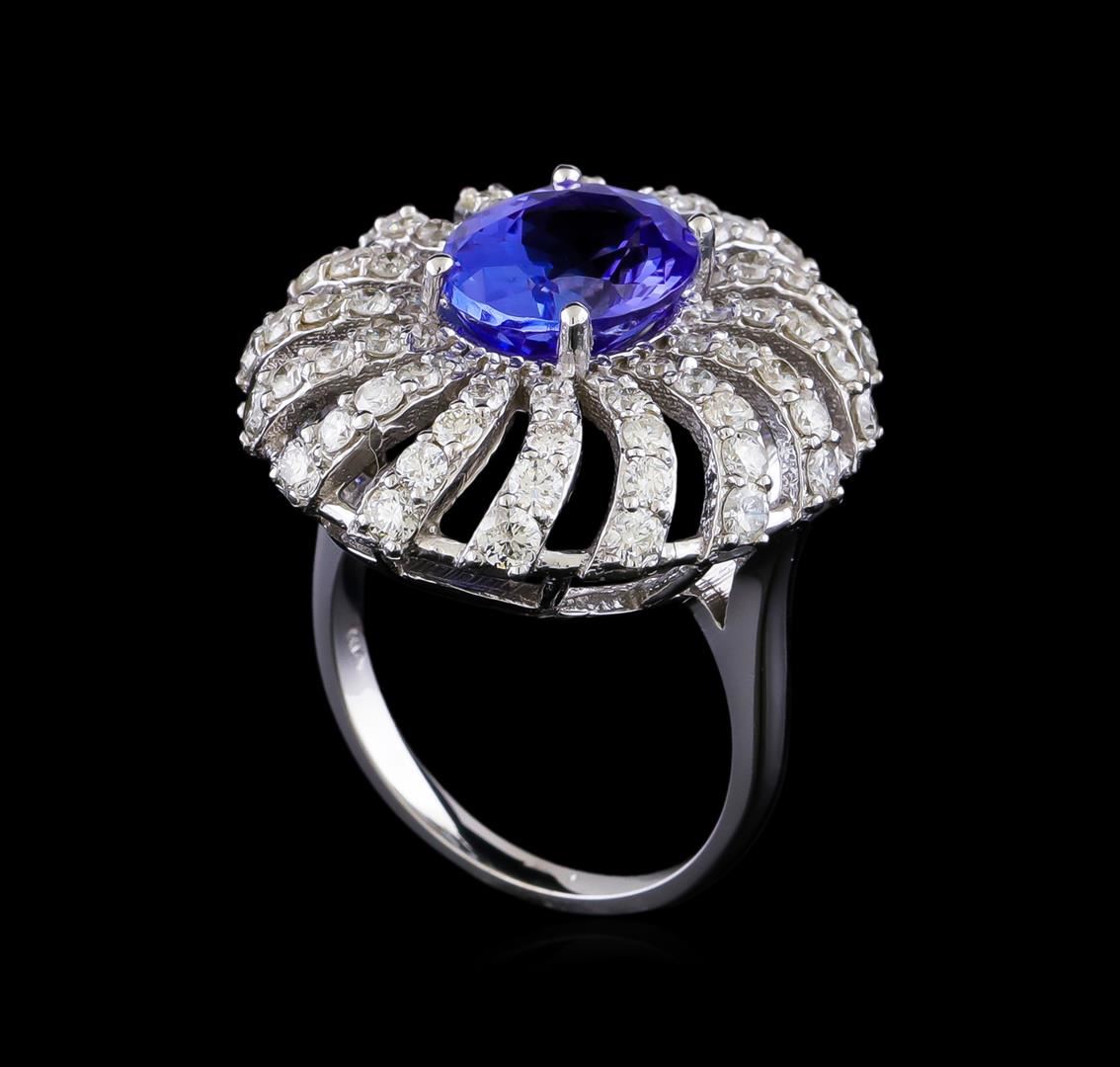 One electronically tested 14KT white gold lady's cast fashion ring with a basket halo with a bright polish finish. The featured lady's ring has a shank measuring 2.01 millimeters in width. Identified with markings of "K14". Condition is new, good workmanship. Containing: One prong set oval oval modified brilliant cut natural tanzanite, measuring 10.90 x 8.89 x 6.01mm, (depth est.) approximate weight of 4.17ct., clarity is eye clean, medium, moderately strong, violetish blue color, (GIA vB 5/4), cut is very good. Transmitting light with no distortion, transparent. Colored gemstones are presumed to have been subjected to commonly used enhancement processes. Graded in the setting. Sixteen prong set round brilliant cut diamonds, measuring 2.30 - 2.20 x 1.37mm (depth est.) approximate total weight of 16 Stones = 0.68ct. Graded in the setting. Clarity: SI-1 to SI-2. Color: H - I. Cut Good Forty-Eight prong set round brilliant cut diamonds, measuring 1.90 - 1.80 x 1.15mm (depth est.) approximate total weight of 48 Stones = 1.17ct. Graded in the setting. Clarity: SI-1 to SI-2. Color: H - I. Cut Good Sixteen prong set round brilliant cut diamonds, measuring 1.60 - 1.50 x 0.96mm (depth est.) approximate total weight of 16 Stones = 0.23ct. Graded in the setting. Clarity: SI-1 to SI-2. Color: G - Good. Total Weight of Colored Stones 4.17ct. Total Weight of Diamonds 2.08ct. Total Weight of Ring 9.70gm. GAS Appraised at $13,060.00.