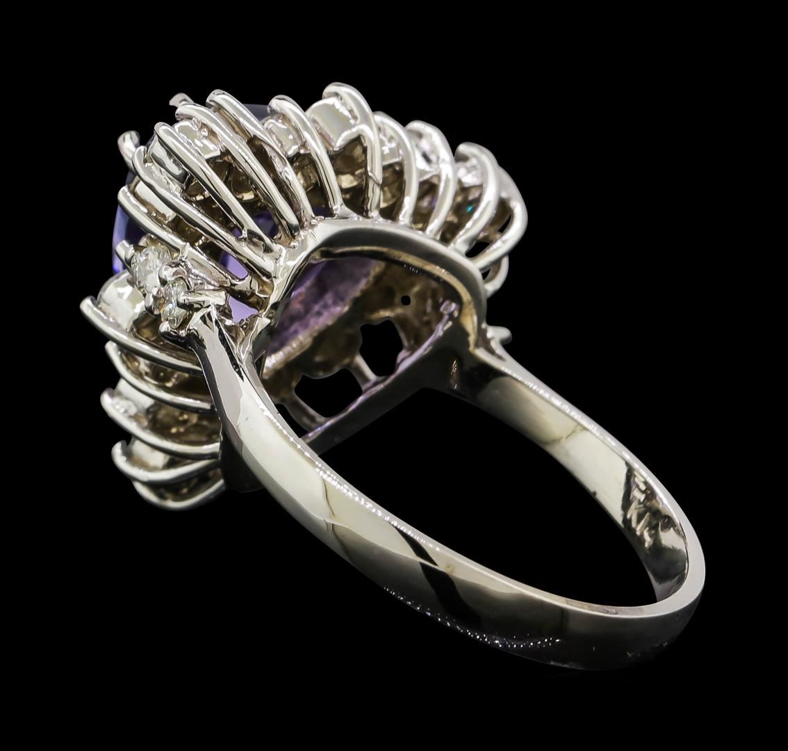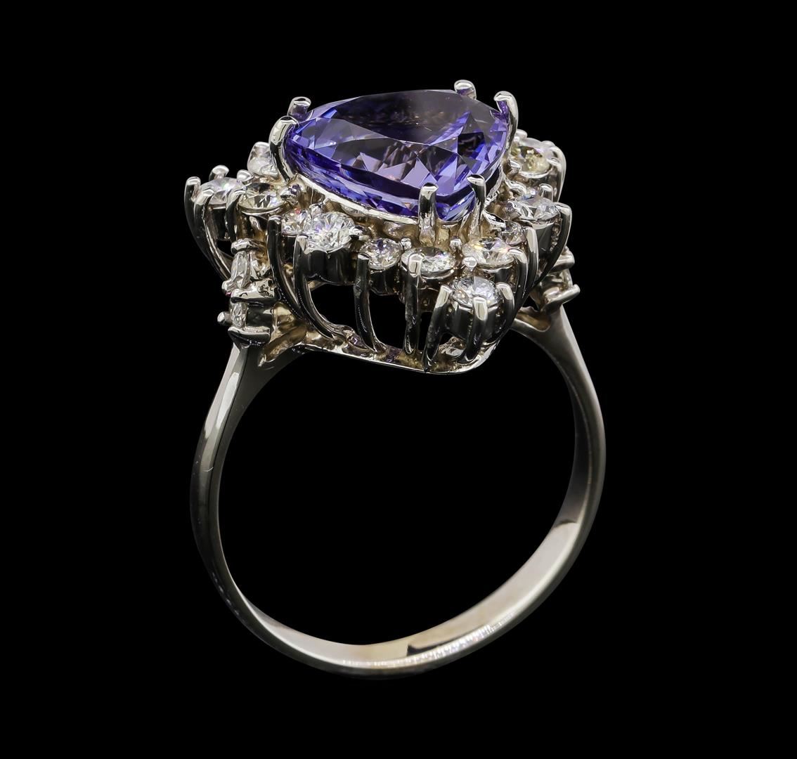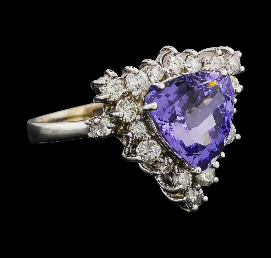 One electronically tested 14KT white gold lady's cast fashion ring with a basket halo with a bright polish finish. The featured lady's ring has a shank measuring 2.50 millimeters wide. Identified with markings of 'K14'. Condition is new, good workmanship. Containing: One prong set triangle modified brilliant cut natural tanzanite, measuring 10.30 x 10.10 x 6.35mm, (depth est.) 5%. bulge factor, approximate weight of 4.17ct., clarity is eye clean, medium light, moderately strong, violet color, (GIA V 4/4), cut is excellent. Transmitting light with no distortion, transparent. Colored gemstones are presumed to have been subjected to commonly used enhancement processes. Graded in the setting. Twelve prong set round brilliant cut diamonds, measuring 2.45 - 2.25 x 1.46mm (depth est.) approximate total weight of 12 Stones = 0.60ct. Graded in the setting. Clarity SI-1 to SI-3. Color: H - I Cut Good Ten prong set round brilliant cut diamonds, measuring 1.95 - 1.85 x 1.14mm (depth est.) approximate total weight of 10 Stones = 0.25ct. Graded in the setting. Clarity SI-1 to I-1. Color: G - H Cut Good. Total Weight of Colored Stones 4.17ct.. Total Weight of Diamonds 0.85ct.. Total Weight of Ring 5.40gm. GAS Appraised at $9,030.00.
