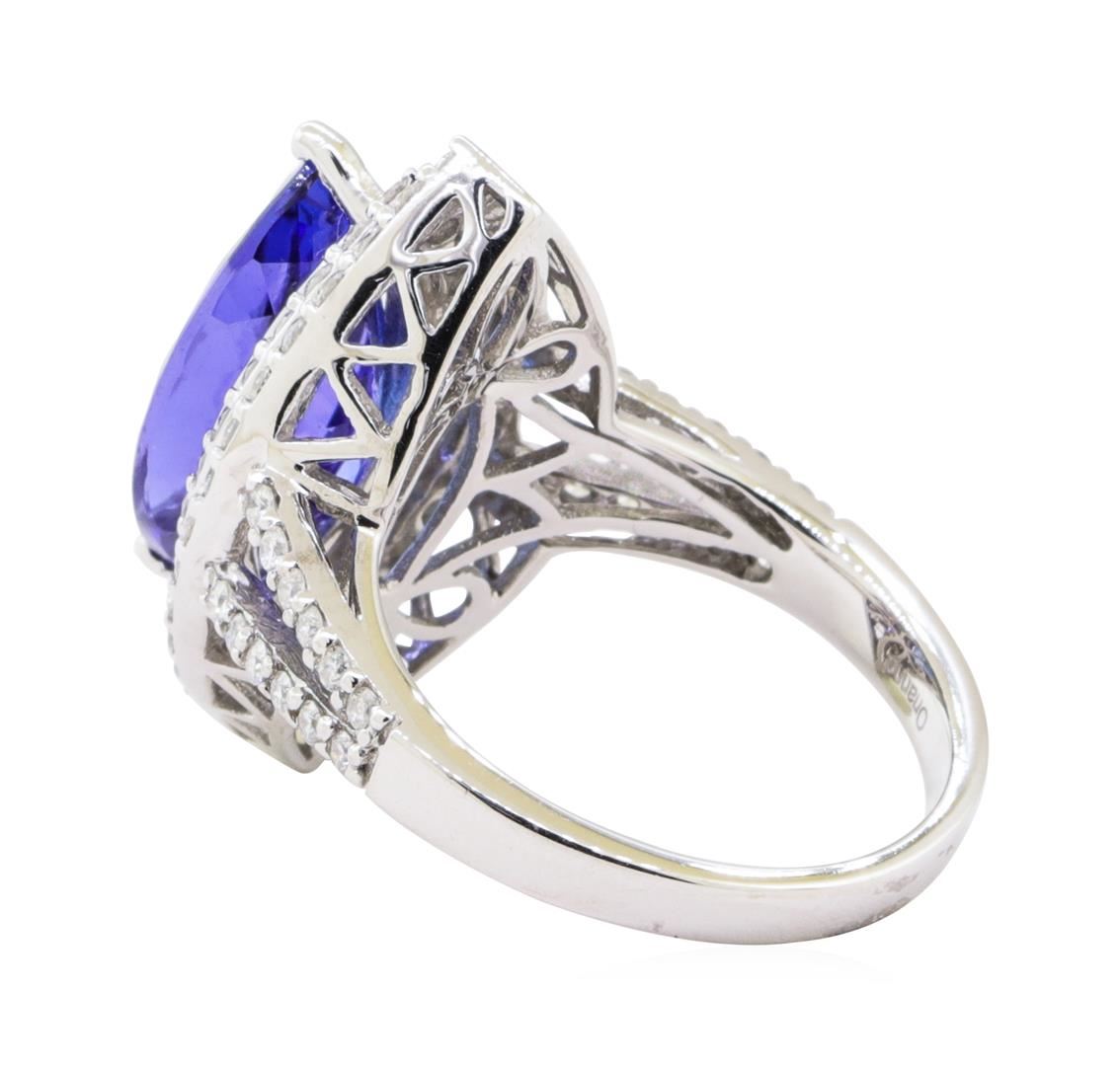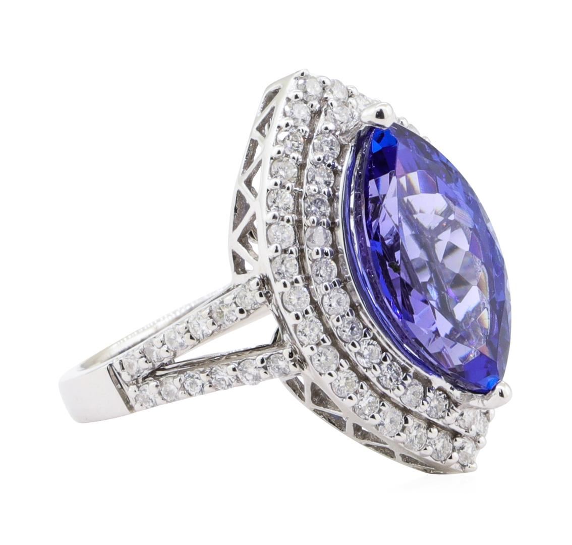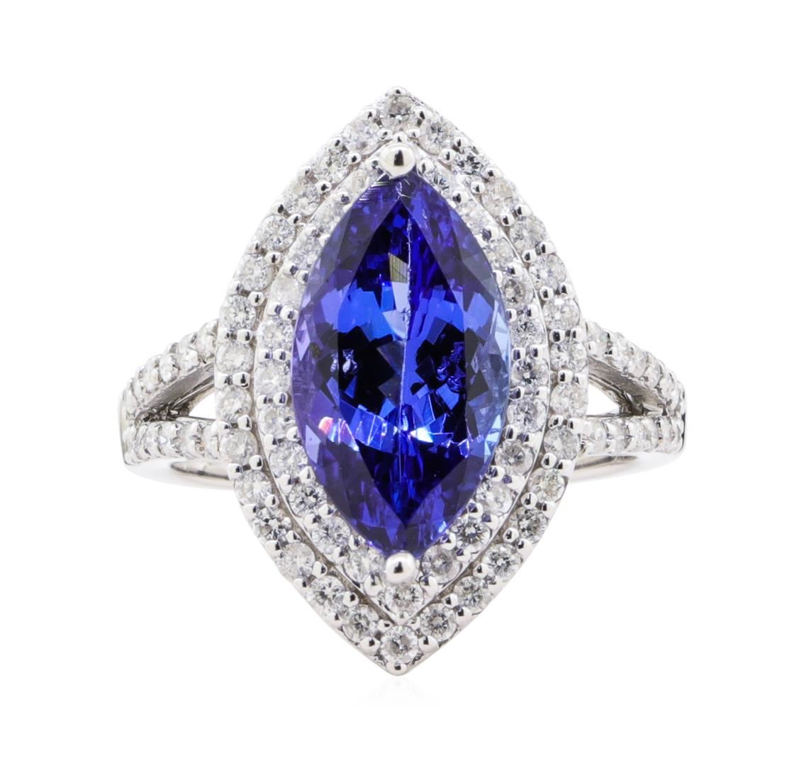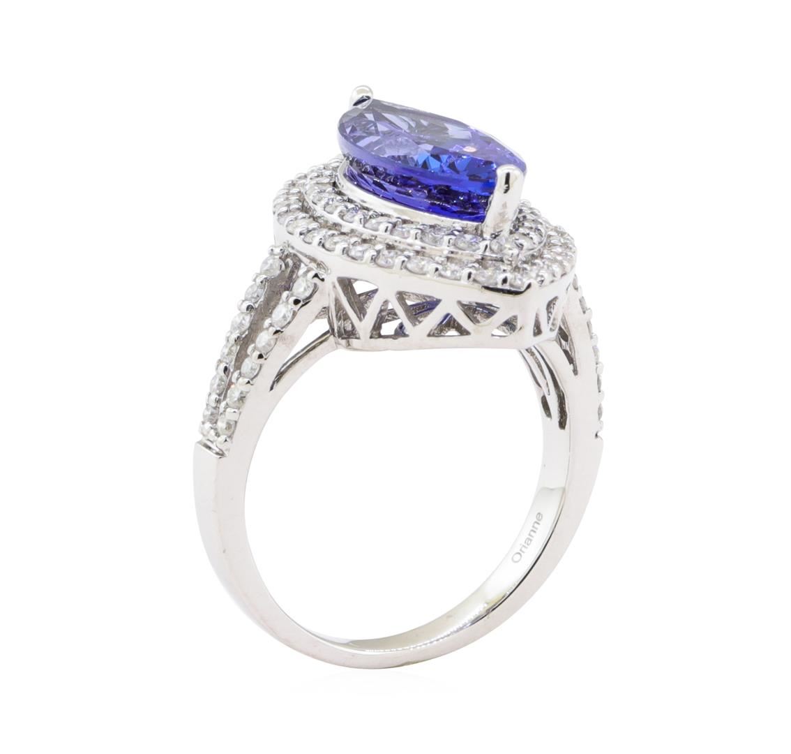 One electronically tested 14KT white gold ladies cast tanzanite and diamond ring with a bright polish finish. The featured tanzanite is set within two tiered diamond bezels supported by diamond set split shoulders, completed by a two millimeter wide band. Trademark is Orianne. Identified with markings of "14K". Condition is new, good workmanship. Containing: One prong set marquise mixed cut natural tanzanite approximate weight of 4.71ct., clarity is eye clean, type I, dark, very slightly grayish, violetish blue color, (GIA vB 7/3), cut is good. Transmitting light with no distortion, transparent. Graded in the setting. Tanzanite is a very rare gemstone that is only found in the country of Tanzania. Originally discovered in 1967. Tiffany & Company, named the stone Tanzanite. It is found in the Usumburu Mountains that border the Umba Valley of northern Tanzania. Tanzanite occurs in gray, brown, violet, blue, reddish-purple, & green. The gem is interesting because of its exceptional pleochroism. Rotated in different directions a tanzanite will exhibit multiple changes of color. Tanzanite has a low tolerance to ultrasonic cleaning, and should not be cleaned using this method. Seventy-Eight prong set round brilliant cut diamonds approximate total weight of 78 Stones = 0.86ct. Graded in the setting. Clarity SI-2 to I-1 Color G - I Total Weight of Colored Stones 4.71 ct. Total Weight of Diamonds 0.86 ct. Total Weight of Ring 6.76 gm Estimated Retail Value $ 14,240.00 US