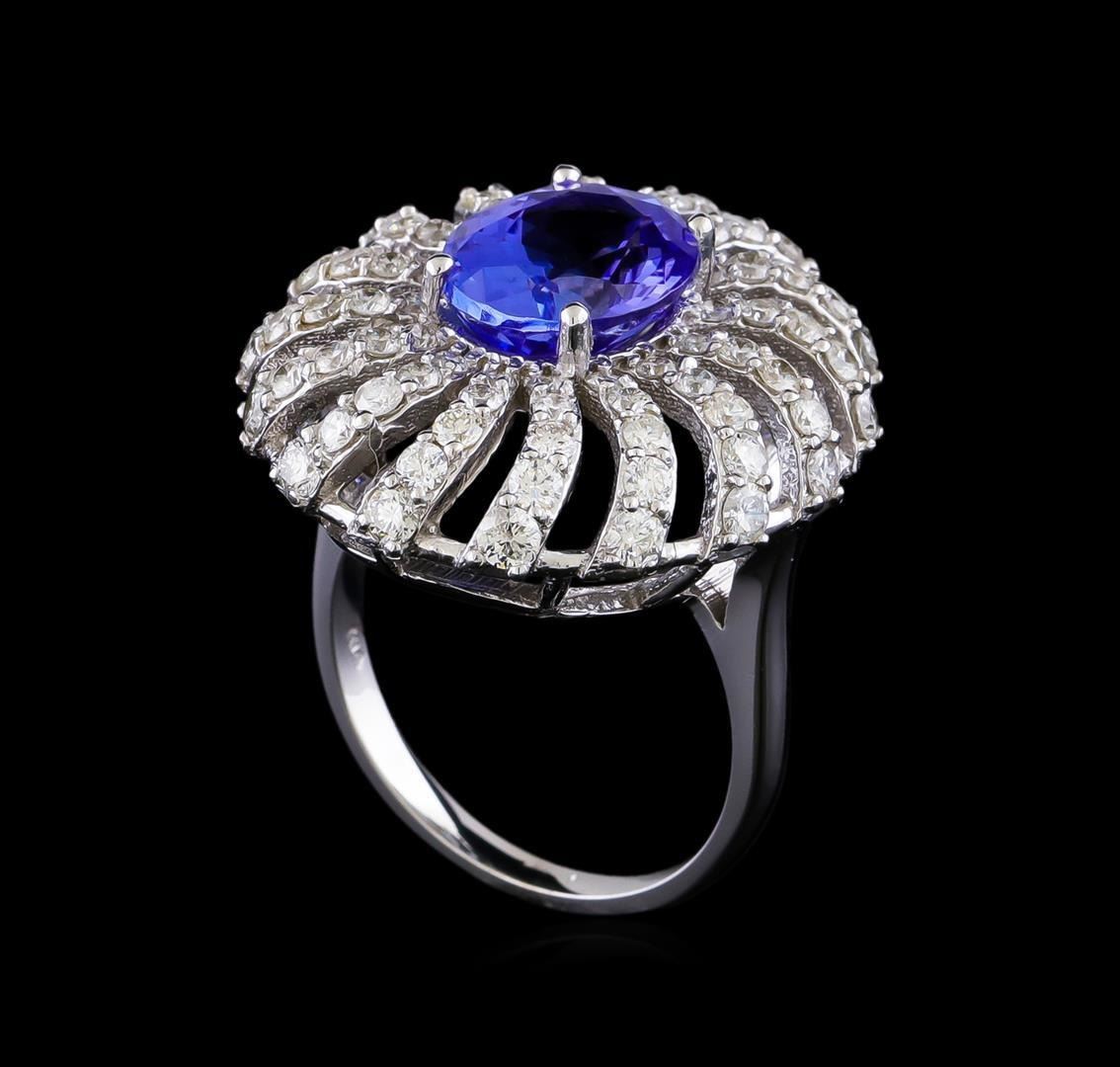 One electronically tested 14KT white gold lady's cast fashion ring with a basket halo with a bright polish finish. The featured lady's ring has a shank measuring 2.01 millimeters in width. Identified with markings of "K14". Condition is new, good workmanship. Containing: One prong set oval oval modified brilliant cut natural tanzanite, measuring 10.90 x 8.89 x 6.01mm, (depth est.) approximate weight of 4.17ct., clarity is eye clean, medium, moderately strong, violetish blue color, (GIA vB 5/4), cut is very good. Transmitting light with no distortion, transparent. Colored gemstones are presumed to have been subjected to commonly used enhancement processes. Graded in the setting. Sixteen prong set round brilliant cut diamonds, measuring 2.30 - 2.20 x 1.37mm (depth est.) approximate total weight of 16 Stones = 0.68ct. Graded in the setting. Clarity: SI-1 to SI-2. Color: H - I. Cut Good Forty-Eight prong set round brilliant cut diamonds, measuring 1.90 - 1.80 x 1.15mm (depth est.) approximate total weight of 48 Stones = 1.17ct. Graded in the setting. Clarity: SI-1 to SI-2. Color: H - I. Cut Good Sixteen prong set round brilliant cut diamonds, measuring 1.60 - 1.50 x 0.96mm (depth est.) approximate total weight of 16 Stones = 0.23ct. Graded in the setting. Clarity: SI-1 to SI-2. Color: G - Good. Total Weight of Colored Stones 4.17ct. Total Weight of Diamonds 2.08ct. Total Weight of Ring 9.70gm. GAS Appraised.