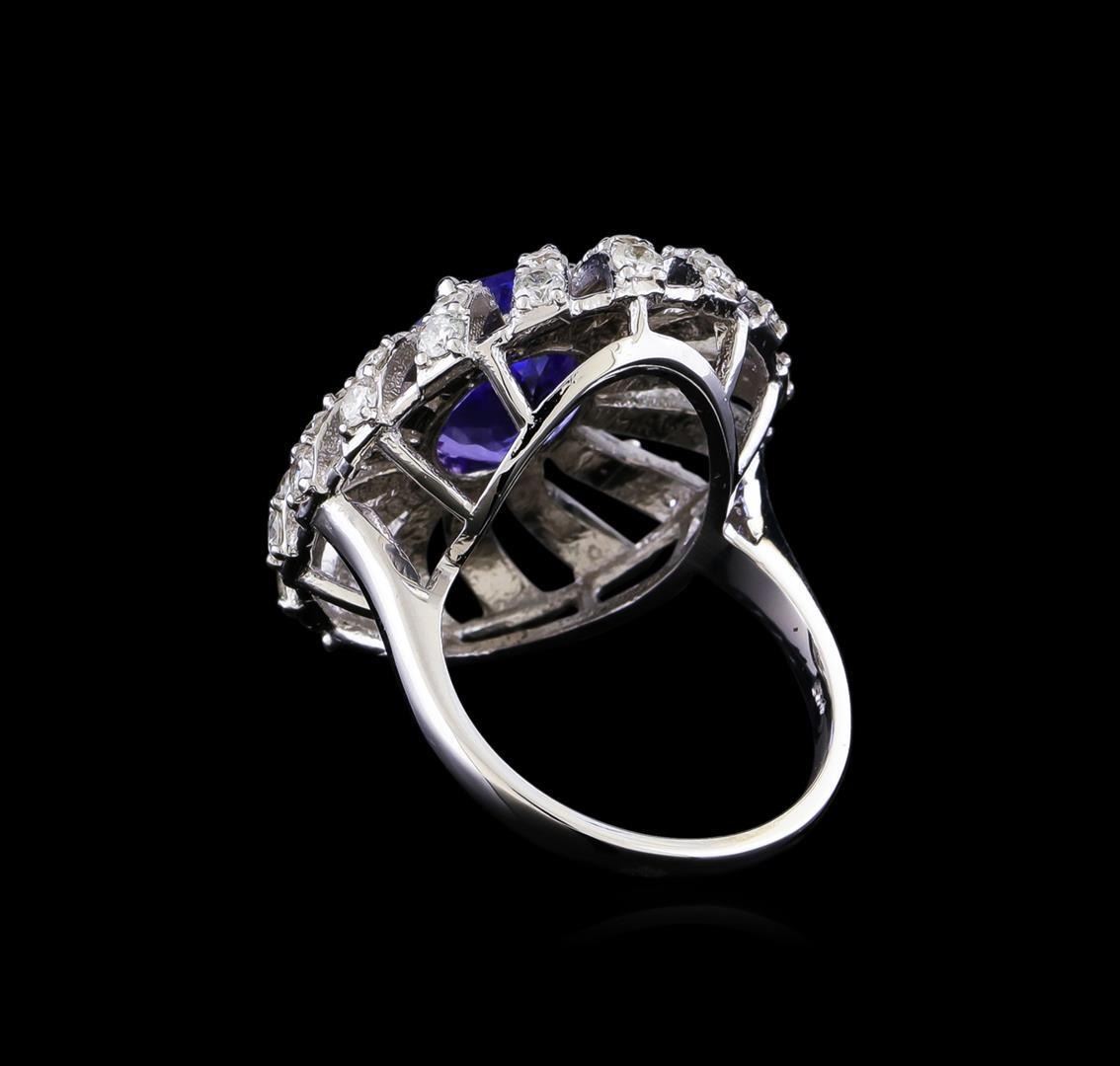 One electronically tested 14KT white gold lady's cast fashion ring with a basket halo with a bright polish finish. The featured lady's ring has a shank measuring 2.01 millimeters in width. Identified with markings of "K14". Condition is new, good workmanship. Containing: One prong set oval oval modified brilliant cut natural tanzanite, measuring 10.90 x 8.89 x 6.01mm, (depth est.) approximate weight of 4.17ct., clarity is eye clean, medium, moderately strong, violetish blue color, (GIA vB 5/4), cut is very good. Transmitting light with no distortion, transparent. Colored gemstones are presumed to have been subjected to commonly used enhancement processes. Graded in the setting. Sixteen prong set round brilliant cut diamonds, measuring 2.30 - 2.20 x 1.37mm (depth est.) approximate total weight of 16 Stones = 0.68ct. Graded in the setting. Clarity: SI-1 to SI-2. Color: H - I. Cut Good Forty-Eight prong set round brilliant cut diamonds, measuring 1.90 - 1.80 x 1.15mm (depth est.) approximate total weight of 48 Stones = 1.17ct. Graded in the setting. Clarity: SI-1 to SI-2. Color: H - I. Cut Good Sixteen prong set round brilliant cut diamonds, measuring 1.60 - 1.50 x 0.96mm (depth est.) approximate total weight of 16 Stones = 0.23ct. Graded in the setting. Clarity: SI-1 to SI-2. Color: G - Good. Total Weight of Colored Stones 4.17ct. Total Weight of Diamonds 2.08ct. Total Weight of Ring 9.70gm. GAS Appraised.