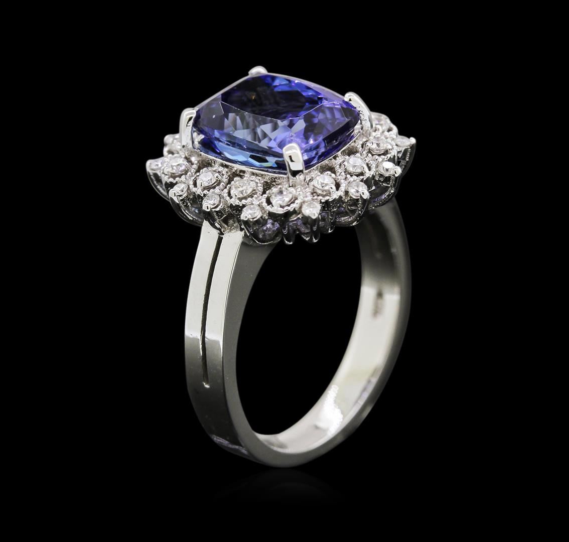 One electronically tested 14KT white gold lady's cast fashion ring with a basket double halo with a bright polish with milgrain detailing finish. The featured lady's ring has a shank measuring 3.00 millimeters wide. Identified with markings of "K14". Condition is new, good workmanship. Containing: One prong set rectangular cushion modified brilliant cut natural tanzanite, measuring 10.10 x 7.97 x 5.98mm, 10% bulge factor, approximate weight of 4.17ct., clarity is eye clean, type I, medium dark, very slightly grayish, bluish violet color, (GIA bV 6/3), cut is good. Transmitting light with no distortion, transparent. Colored gemstones are presumed to have been subjected to commonly used enhancement processes. Graded in the setting. Fourteen prong set round brilliant cut diamonds, measuring 1.60 - 1.55 x 1.03mm (depth est.) approximate total weight of 14 Stones = 0.22ct. Graded in the setting. Clarity: SI-2 to I-1. Color: H - I. Cut Good Fourteen prong set round brilliant cut diamonds, measuring 1.10 - 1.05 x 0.70mm (depth est.) approximate total weight of 14 Stones = 0.07ct. Clarity: SI-2 to I-1. Color: H - I. Cut Good. Total Weight of Colored Stones 4.17ct. Total Weight of Diamonds 0.29ct. Total Weight of Ring 6.80gm. GAS Appraised at $6,315.00.