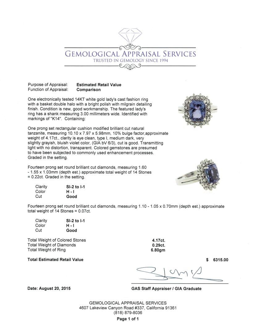 One electronically tested 14KT white gold lady's cast fashion ring with a basket double halo with a bright polish with milgrain detailing finish. The featured lady's ring has a shank measuring 3.00 millimeters wide. Identified with markings of "K14". Condition is new, good workmanship. Containing: One prong set rectangular cushion modified brilliant cut natural tanzanite, measuring 10.10 x 7.97 x 5.98mm, 10% bulge factor, approximate weight of 4.17ct., clarity is eye clean, type I, medium dark, very slightly grayish, bluish violet color, (GIA bV 6/3), cut is good. Transmitting light with no distortion, transparent. Colored gemstones are presumed to have been subjected to commonly used enhancement processes. Graded in the setting. Fourteen prong set round brilliant cut diamonds, measuring 1.60 - 1.55 x 1.03mm (depth est.) approximate total weight of 14 Stones = 0.22ct. Graded in the setting. Clarity: SI-2 to I-1. Color: H - I. Cut Good Fourteen prong set round brilliant cut diamonds, measuring 1.10 - 1.05 x 0.70mm (depth est.) approximate total weight of 14 Stones = 0.07ct. Clarity: SI-2 to I-1. Color: H - I. Cut Good. Total Weight of Colored Stones 4.17ct. Total Weight of Diamonds 0.29ct. Total Weight of Ring 6.80gm. GAS Appraised at $6,315.00.