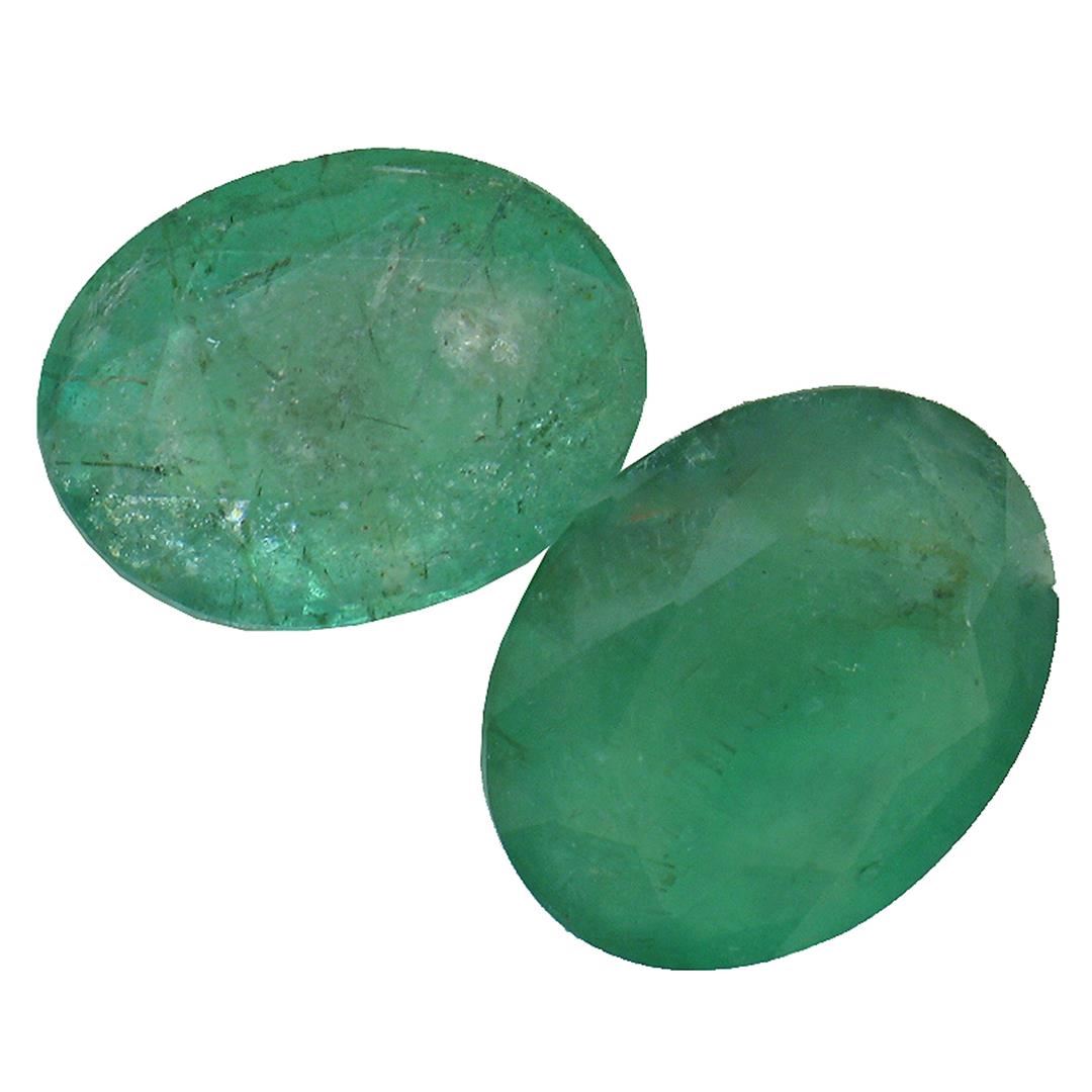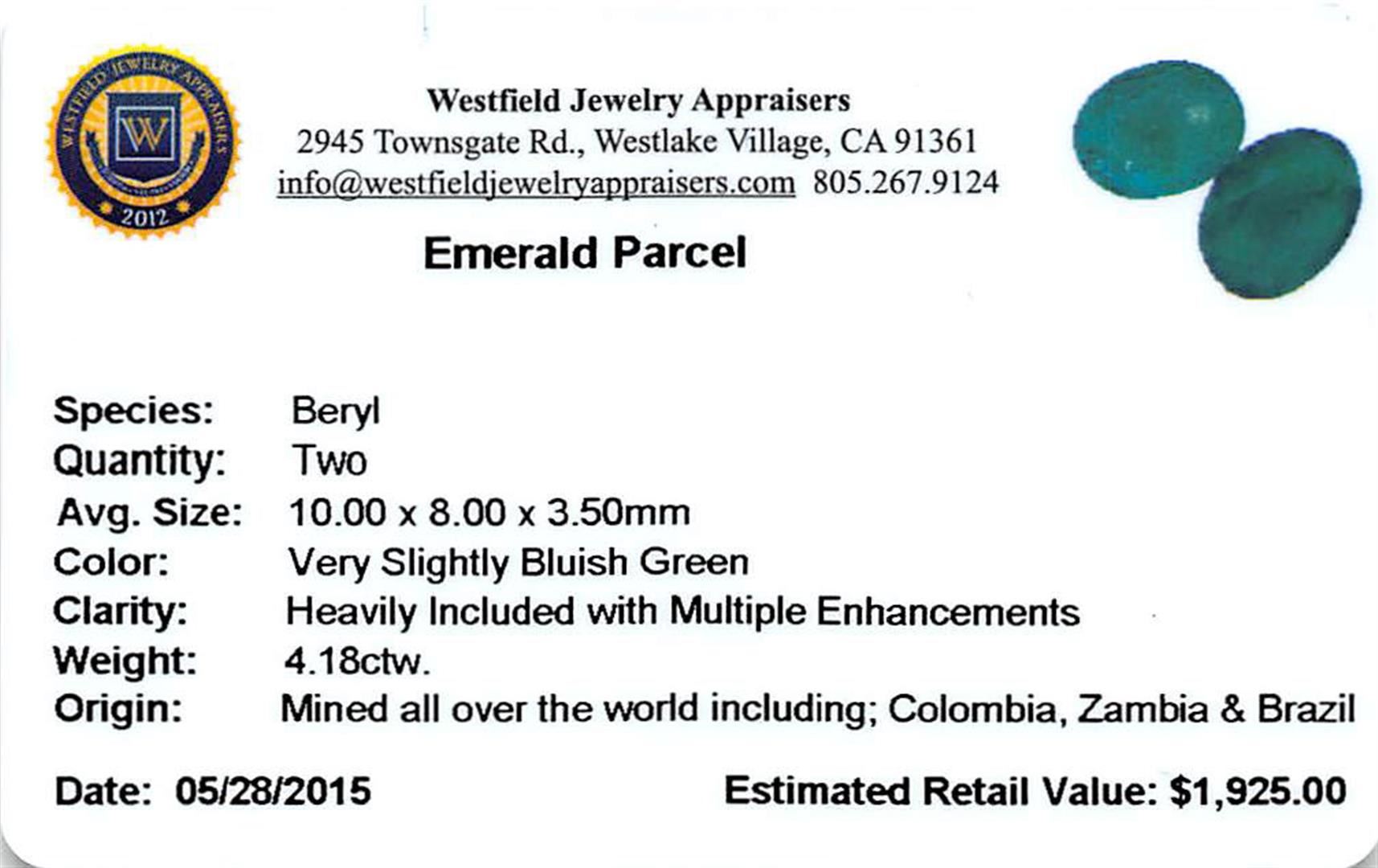 Two oval mixed cut natural emeralds, measuring 10.00 x 8.00 x 3.50mm, exact total weight 4.18ct., clarity is heavily included, type III, medium dark, very slightly grayish, very slightly bluish green color, (GIA vslbG 6/3), cut is good. Transmitting light somewhat diffusely, translucent, Naturally occurring internal & external characteristics are present, Indications of multiple laboratory enhancements, including high temperature heat treatment. Westfield Appraised at $1,925.00.