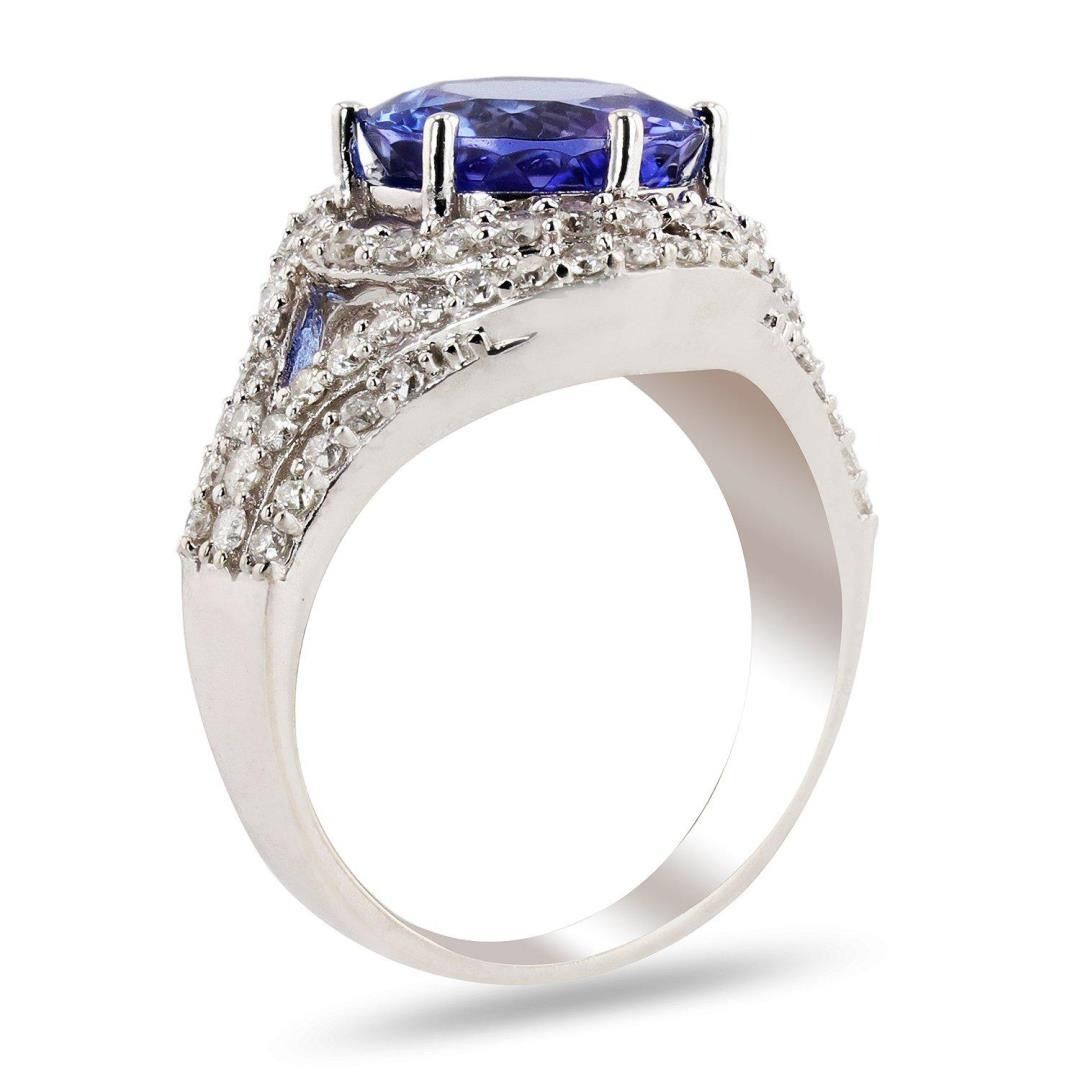 ONE 14K STAMPED WHITE GOLD LADIES CUSTOM MADE DIAMOND AND TANZANITE RING. 6.20 GR TW. 1 - MAIN CFNTER GEMSTONE(S) IDENTITY: ONE CENTER NATURAL TANZANITE SET IN 6 PRONGS SETTING. CARAT WEIGHT: 4.18 CTS. SHAPE AND MEASUREMEMT: ROUND CUT. APPROX: 9.94