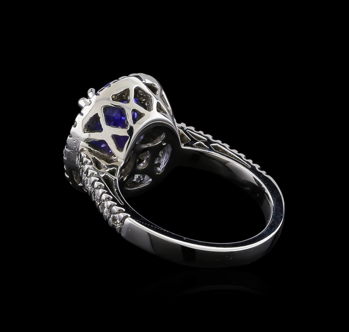 One electronically tested 14KT white gold lady's cast fashion ring with a basket halo with a bright polish finish. The featured lady's ring has a shank measuring 2.57 millimeters wide. Identified with markings of "14K". Condition is new, good workmanship. Containing: One prong set oval modified brilliant cut natural tanzanite, measuring 12.33 x 8.86 x 5.55mm, approximate weight of 4.18ct., clarity is eye clean, type I, medium, moderately strong, bluish violet color, (GIA bV 5/4), cut is very good. Transmitting light with no distortion, transparent. Colored gemstones are presumed to have been subjected to commonly used enhancement processes. Graded in the setting. Twenty-Eight prong set round brilliant cut diamonds, measuring 1.75 - 1.65 x 1.05mm (depth est.) approximate total weight of 28 Stones = 0.52ct. Graded in the setting. Clarity: SI-1 to SI-2. Color: H - I. Cut Good. Total Weight of Colored Stones 4.18ct. Total Weight of Diamonds 0.52ct. Total Weight of Ring 7.90gm. GAS Appraised.