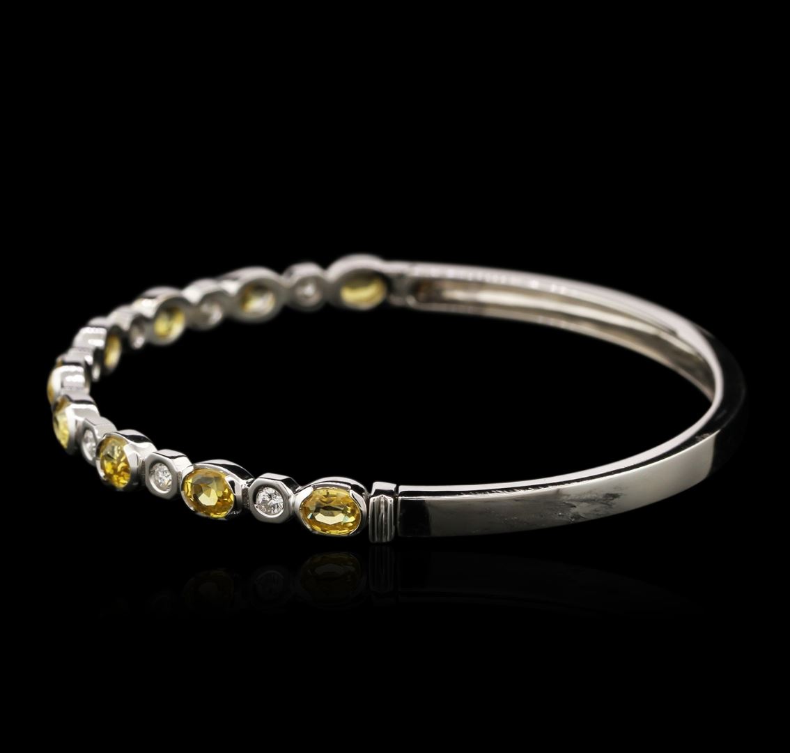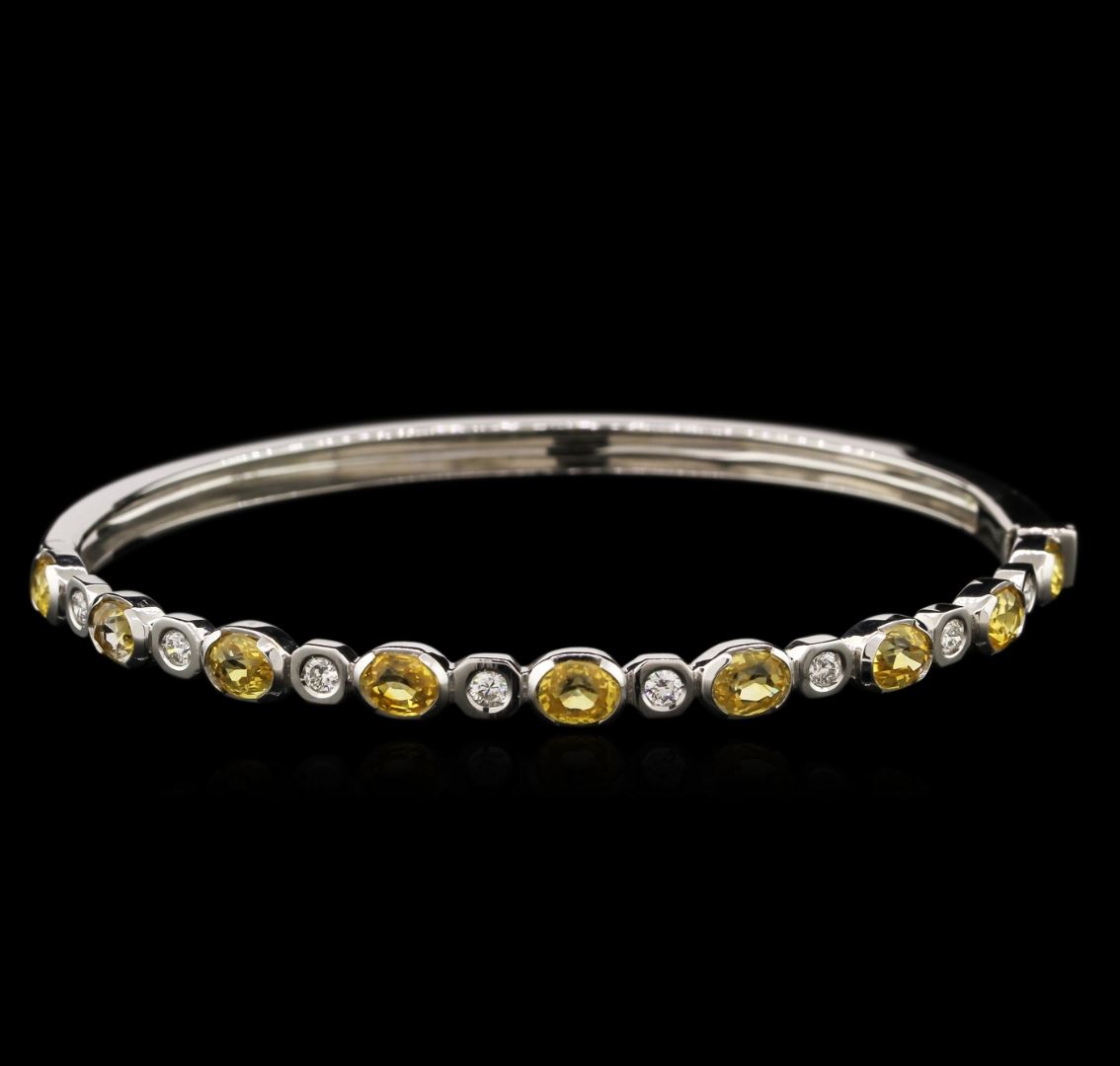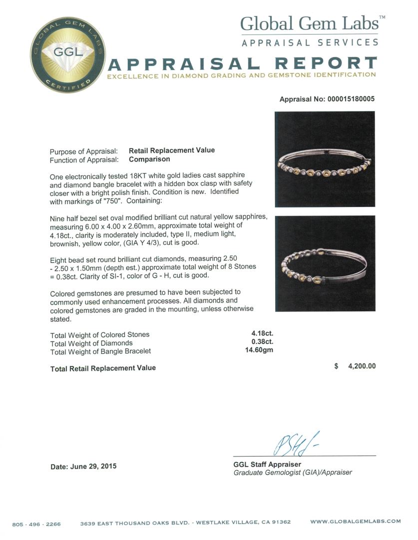 One electronically tested 18KT white gold ladies cast sapphire and diamond bangle bracelet with a hidden box clasp with safety closer with a bright polish finish. Identified with markings of "750". Condition is new. Containing: Nine half bezel set oval modified brilliant cut natural yellow sapphires, measuring 6.00 x 4.00 x 2.60mm, approximate total weight of 4.18ct., clarity is moderately included, type II, medium light, brownish, yellow color, (GIA Y 4/3), cut is good. Eight bead set round brilliant cut diamonds, measuring 2.50 - 2.50 x 1.50mm (depth est.) approximate total weight of 8 Stones = 0.38ct. Clarity: SI-1. Color: G - H, Cut is Good. Colored gemstones are presumed to have been subjected to commonly used enhancement processes. All diamonds and colored gemstones are graded in the mounting, unless otherwise stated. Total Weight of Colored Stones 4.18ct. Total Weight of Diamonds 0.38ct. Total Weight of Bangle Bracelet 14.60 grams. GGL Appraised at $4,200.00.