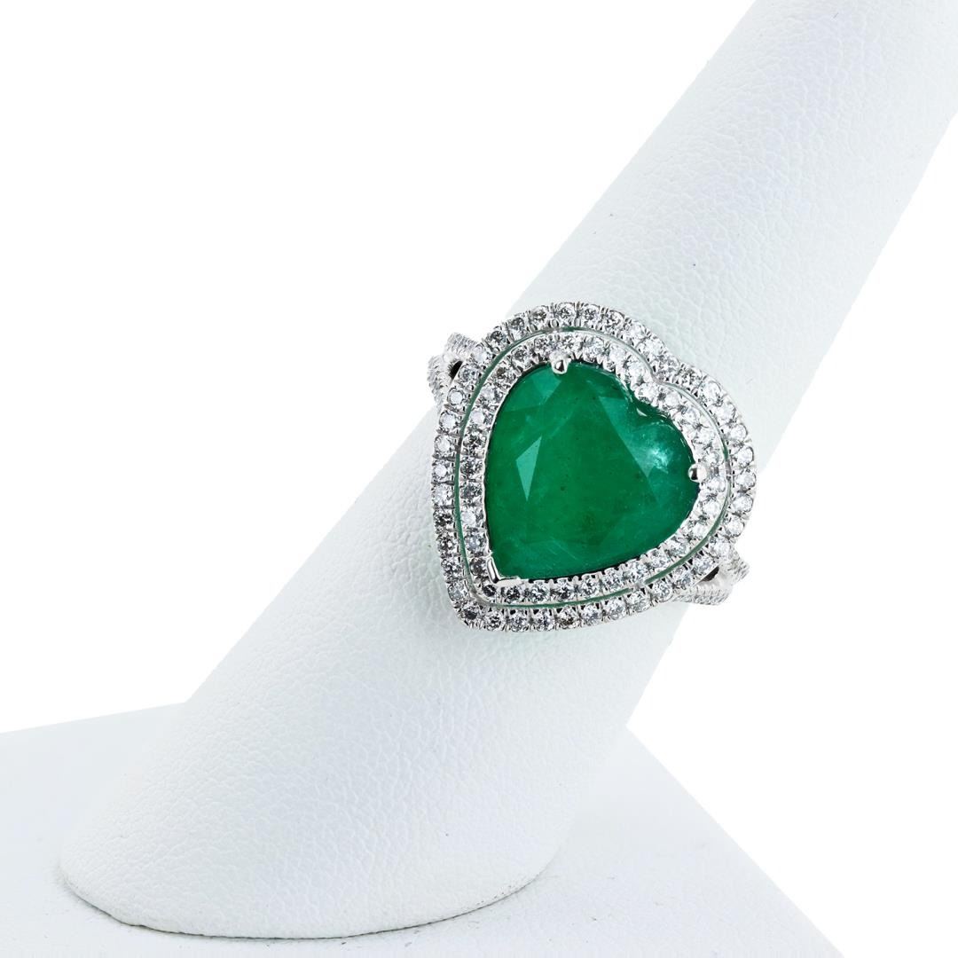 Platinum (PLAT) natural emerald beryl and diamond ring. A heart brilliant cut natural emerald beryl gemstone is mounted in the center of the ring. Round brilliant cut diamonds accent the ring around and on both sides of the center gemstone. The ring has 1 gross weight of 9.0 Grams. Reference: GIA Emerald Report #2235049191 #NATURAL GEMSTONE# GEMSTONE: Emerald Beryl NATURE: Natural SHAPE: Heart Brilliant, Faceted Cut WEIGHT: 4.19 carat total DIMENSIONS: 11.45 10.87 x 6.12mm CLARITY: Type 3 COLOR: Green (5/5) SYMMETRY: Excellent COLOR INTENSITY: Intense TRANSPARENCY: Transparent-Semi Transparent TONE: Dark #NATURAL DIAMOND# SHAPE: Round Brilliant Cut WEIGHT: 0.76 carat total (128pcs.) DIMENSIONS: 1.2 x 1.0mm AVERAGE CLARITY: VS1-VS2 AVERAGE COLOR: F-G POLISH: Excellent #METAL# METAL: Platinum PURITY: 950 COLOR: White CONDITION: Excellent FINISH: High Polish #LREF-7113