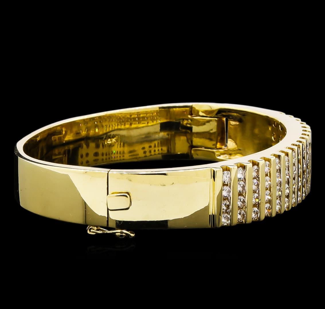 One electronically tested 14KT yellow gold ladies cast & assembled diamond bangle bracelet. The six and three-quarter inch wearable length hinged bangle bracelet features a twelve millimeter wide gallery of parallel diamond ribbons terminating in a box clasp with safety. Bright polish finish. Identified with markings of "14K". Condition is good. Containing: Sixty-Eight channel set round brilliant cut diamonds, measuring 2.65 - 2.50 x 1.55mm (depth est.) approximate total weight of 68 Stones = 4.20ct. Graded in the setting. Clarity: VS-2 to SI-1. Color: G - H. Total Weight of Diamonds 4.20ct. Total Weight of Bangle Bracelet 56.48gm. AIG Appraised at $23,350.00.