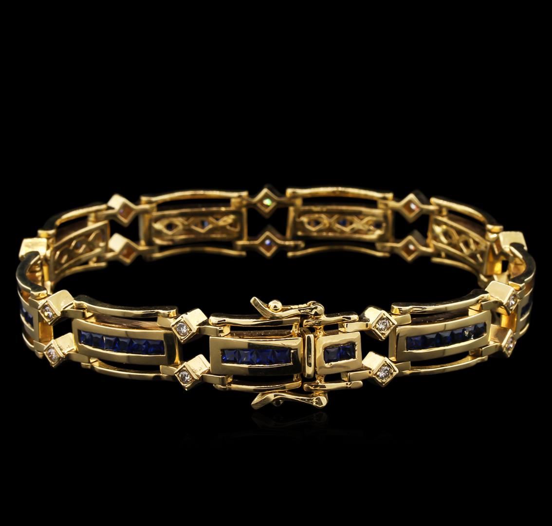 One electronically tested 14KT yellow gold man's combination cast & assembled fashion bracelet with a tongue clasp with fold over safety with a bright polish finish. The featured bracelet is 7.75 inches in length. Identified with markings of "14K". Condition is new, good workmanship. Containing: Fifty-four channel set princess modified brilliant cut natural blue sapphires, measuring 2.40 x 2.30 x 1.50mm, approximate total weight of 4.20ct., clarity is slightly included, type II, medium dark, moderately strong, blue color, (GIA B 6/4), cut is very good. Transmitting light with a minimum of distortion, transparent. Colored gemstones are presumed to have been subjected to commonly used enhancement processes. Graded in the setting. Eighteen prong set round brilliant cut diamonds, measuring 2.10 - 2.00 x 1.33mm (depth est.) approximate total weight of 18 Stones = 0.62ct. Graded in the setting. Clarity: VS-2 to SI-1. Color: H - I. Cut Very Good. Total Weight of Colored Stones 4.20ct. Total Weight of Diamonds 0.62ct. Total Weight of Bracelet 41.70gm. GAS Appraised at $7,070.00.