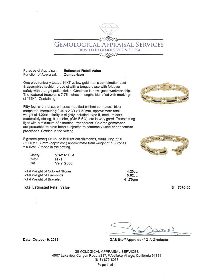 One electronically tested 14KT yellow gold man's combination cast & assembled fashion bracelet with a tongue clasp with fold over safety with a bright polish finish. The featured bracelet is 7.75 inches in length. Identified with markings of "14K". Condition is new, good workmanship. Containing: Fifty-four channel set princess modified brilliant cut natural blue sapphires, measuring 2.40 x 2.30 x 1.50mm, approximate total weight of 4.20ct., clarity is slightly included, type II, medium dark, moderately strong, blue color, (GIA B 6/4), cut is very good. Transmitting light with a minimum of distortion, transparent. Colored gemstones are presumed to have been subjected to commonly used enhancement processes. Graded in the setting. Eighteen prong set round brilliant cut diamonds, measuring 2.10 - 2.00 x 1.33mm (depth est.) approximate total weight of 18 Stones = 0.62ct. Graded in the setting. Clarity: VS-2 to SI-1. Color: H - I. Cut Very Good. Total Weight of Colored Stones 4.20ct. Total Weight of Diamonds 0.62ct. Total Weight of Bracelet 41.70gm. GAS Appraised at $7,070.00.