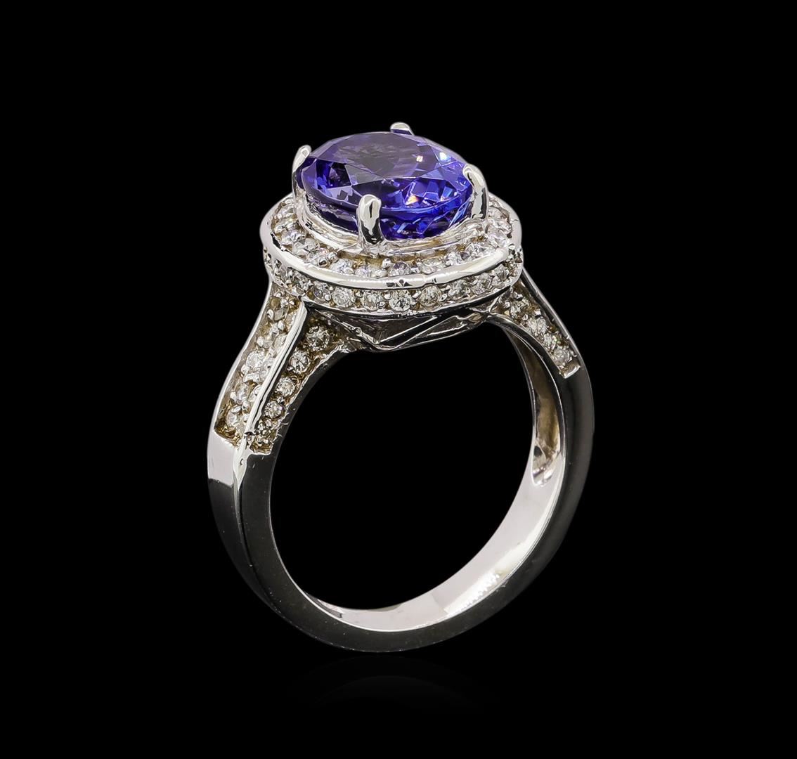 One electronically tested 14KT white gold lady's cast fashion ring with a split shank halo with a bright polish finish. The featured lady's ring has a double shank measuring 2.80 millimeters wide. Identified with markings of '14K'. Condition is new, good workmanship. Containing: One prong set oval modified brilliant cut natural tanzanite, measuring 10.68 x 8.84 x 6.25mm, (depth est.) approximate weight of 4.20ct., clarity is eye clean, medium, very slightly grayish, bluish violet color, (GIA bV 5/3), cut is very good. Transmitting light with no distortion, transparent. Colored gemstones are presumed to have been subjected to commonly used enhancement processes. Graded in the setting. Two bezel set round brilliant cut diamonds, measuring 2.10 - 2.05 x 1.29mm (depth est.) approximate total weight of 2 Stones = 0.07ct. Graded in the setting. Clarity SI-1 to SI-2. Color: H - I Cut Very Good Fifty-Four prong set round brilliant cut diamonds, measuring 1.40 - 1.25 x 0.82mm (depth est.) approximate total weight of 54 Stones = 0.47ct. Graded in the setting. Clarity SI-1 to SI-2. Color: H - I Cut Good Twenty-Two prong set round brilliant cut diamonds, measuring 1.20 - 1.10 x 0.69mm (depth est.) approximate total weight of 22 Stones = 0.12ct. Graded in the setting. Clarity SI-1 to I-1. Color: G - H Cut Good. Total Weight of Colored Stones 4.20ct.. Total Weight of Diamonds 0.66ct.. Total Weight of Ring 5.30gm. GAS Appraised at $9,210.00.