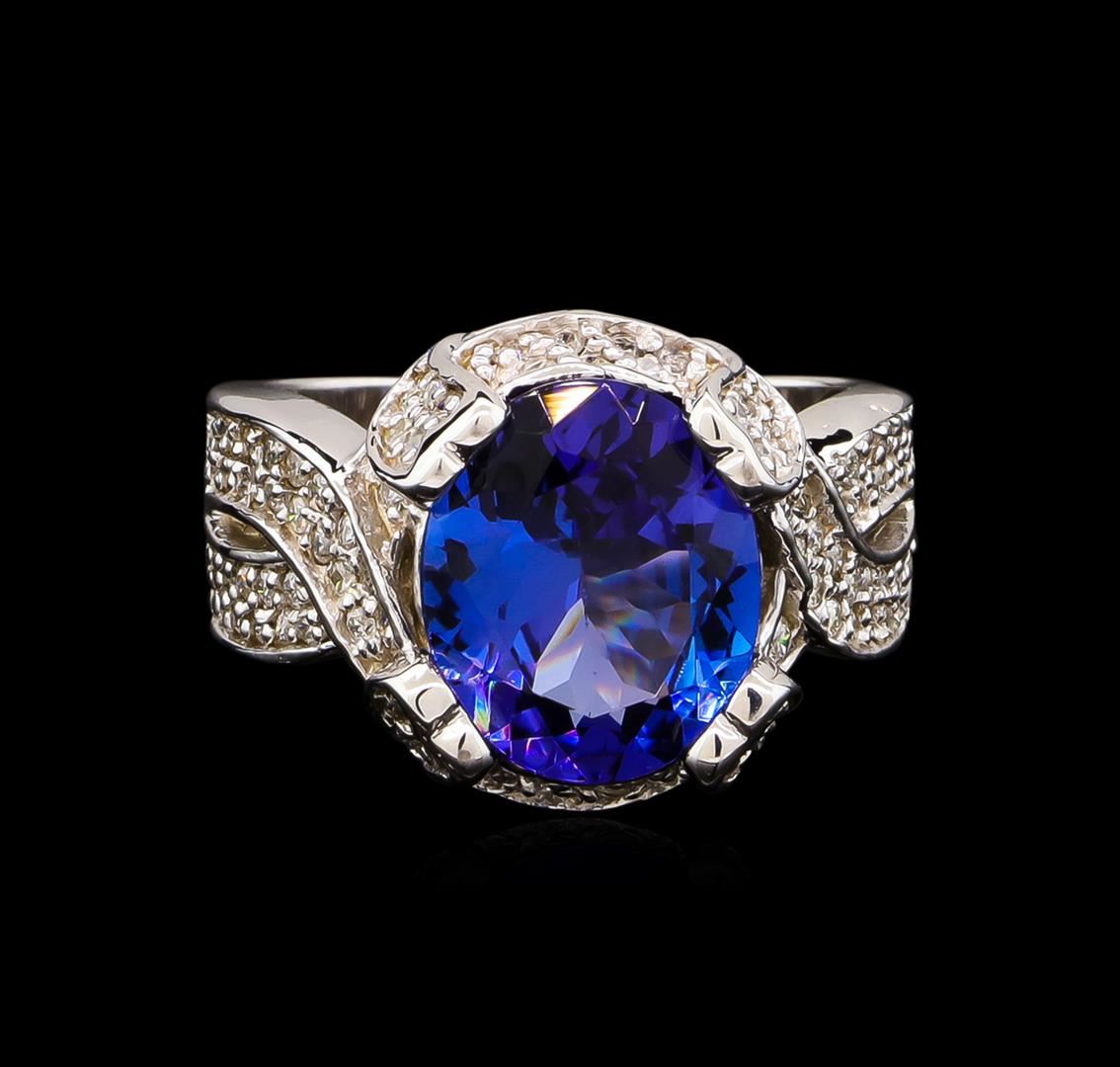 One electronically tested 14KT white gold lady's cast fashion ring with a crossover bypass shank with a bright polish finish. The featured lady's ring has a shank measuring 4.30 millimeters wide. Identified with markings of "14K". Condition is new, good workmanship. Containing: One prong set oval modified brilliant cut natural tanzanite, measuring 11.86 x 9.91 x 5.31mm, approximate weight of 4.20ct., clarity is eye clean, type I, medium dark, moderately strong, violetish blue color, (GIA vB 6/4), cut is very good. Transmitting light with no distortion, transparent. Colored gemstones are presumed to have been subjected to commonly used enhancement processes. Graded in the setting. Two prong set round brilliant cut diamonds, measuring 1.60 - 1.50 x 0.96mm (depth est.) approximate total weight of 2 Stones = 0.03ct. Graded in the setting. Clarity: SI-1 to SI-2. Color: G - H. Cut Good Eighty-Six prong set round brilliant cut diamonds, measuring 1.25 - 1.20 x 0.74mm (depth est.) approximate total weight of 86 Stones = 0.56ct. Graded in the setting. Clarity: SI-1 to SI-2. Color: G - I. Cut Good. Total Weight of Colored Stones 4.20ct. Total Weight of Diamonds 0.59ct. Total Weight of Ring 8.90gm. GAS Appraised at $10,705.00.