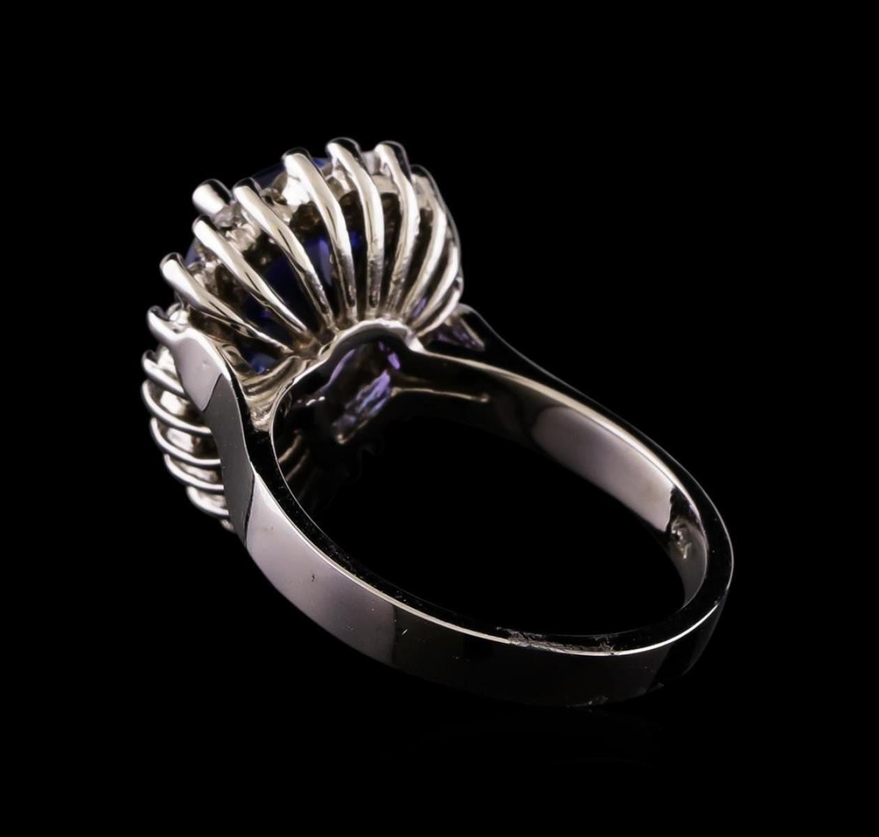One electronically tested 14KT white gold lady's cast fashion ring with a basket halo with a bright polish finish. The featured lady's ring has a shank measuring 2.70 millimeters wide. Identified with markings of '14K'. Condition is new, good workmanship. Containing: One prong set pear modified brilliant cut natural tanzanite, measuring 11.63 x 8.44 x 6.27mm, (depth est.) approximate weight of 4.20ct., clarity is eye clean, medium, very slightly grayish, violetish blue color, (GIA vB 5/3), cut is good. Transmitting light with no distortion, transparent. Colored gemstones are presumed to have been subjected to commonly used enhancement processes. Graded in the setting. Twenty-Two prong set round brilliant cut diamonds, measuring 1.80 - 1.75 x 1.10mm (depth est.) approximate total weight of 22 Stones = 0.48ct. Graded in the setting. Clarity SI-1 to SI-2. Color: G - H Cut Good. Total Weight of Colored Stones 4.20ct.. Total Weight of Diamonds 0.48ct.. Total Weight of Ring 6.20gm.