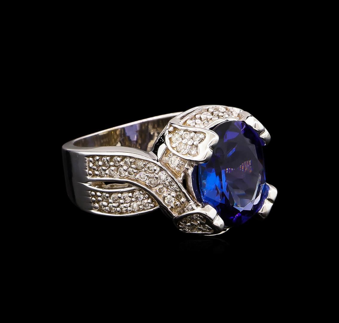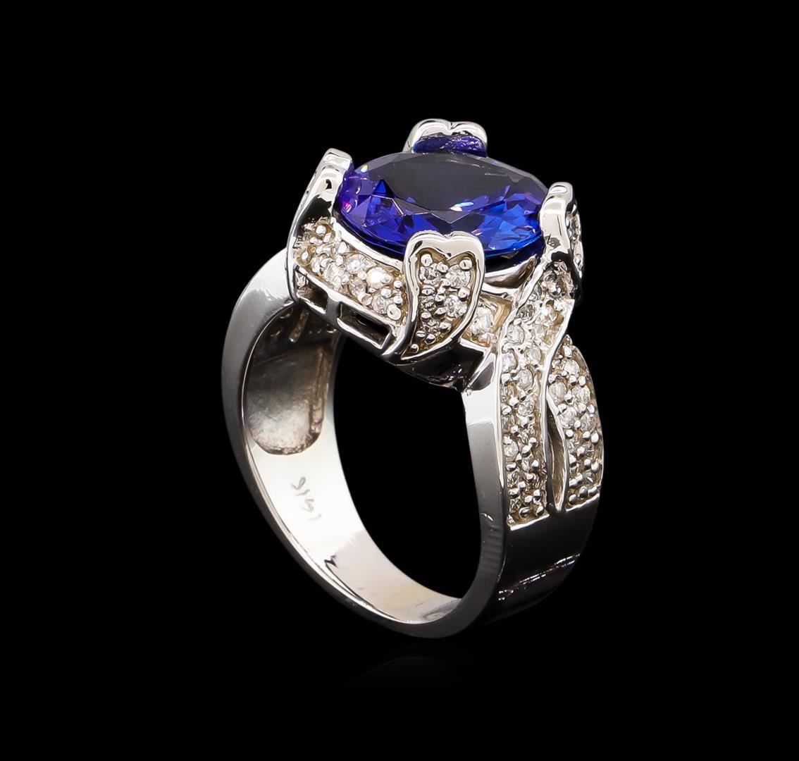 One electronically tested 14KT white gold lady's cast fashion ring with a crossover bypass shank with a bright polish finish. The featured lady's ring has a shank measuring 4.30 millimeters wide. Identified with markings of "14K". Condition is new, good workmanship. Containing: One prong set oval modified brilliant cut natural tanzanite, measuring 11.86 x 9.91 x 5.31mm, approximate weight of 4.20 ct., clarity is eye clean, type I, medium dark, moderately strong, violetish blue color, (GIA vB 6/4), cut is very good. Transmitting light with no distortion, transparent. Colored gemstones are presumed to have been subjected to commonly used enhancement processes. Graded in the setting. Two prong set round brilliant cut diamonds, measuring 1.60 - 1.50 x 0.96mm (depth est.) approximate total weight of 2 Stones = 0.03ct. Graded in the setting. Clarity: SI-1 to SI-2. Color: G - H. Cut Good Eighty-Six prong set round brilliant cut diamonds, measuring 1.25 - 1.20 x 0.74mm (depth est.) approximate total weight of 86 Stones = 0.56ct. Graded in the setting. Clarity: SI-1 to SI-2. Color: G - I. Cut Good. Total Weight of Colored Stones 4.20 ct. Total Weight of Diamonds 0.59ct. Total Weight of Ring 8.90gm.