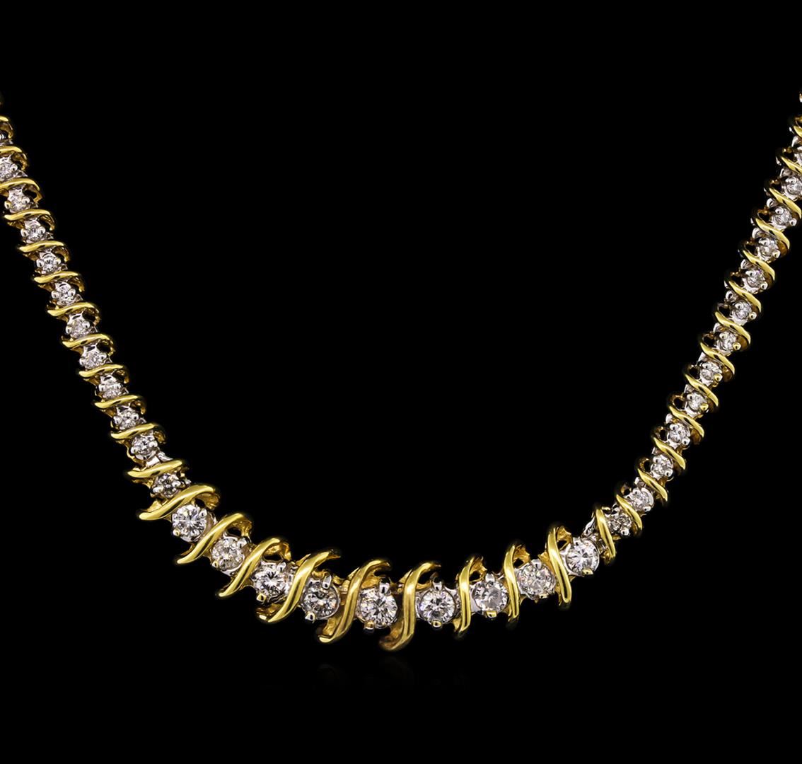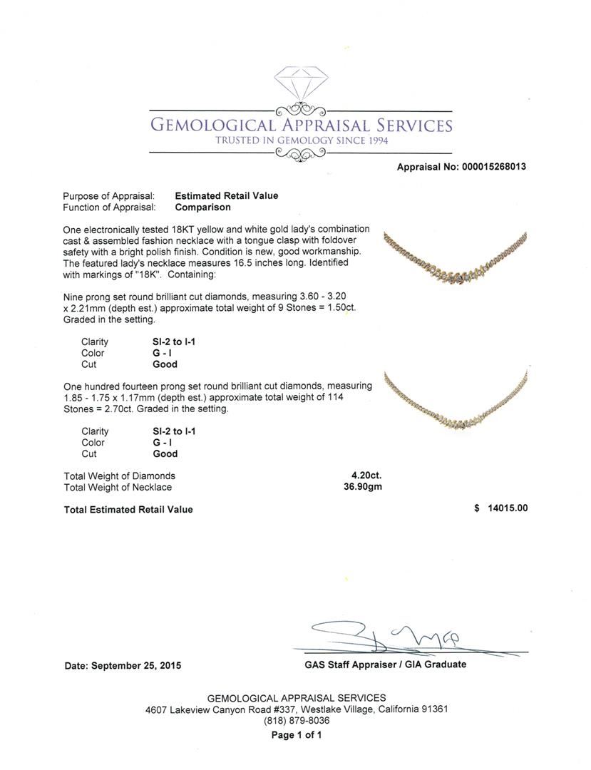 One electronically tested 18KT yellow and white gold lady's combination cast & assembled fashion necklace with a tongue clasp with foldover safety with a bright polish finish. The featured lady's necklace measures 16.5 inches long. Identified with markings of "18K". Condition is new, good workmanship. Containing: Nine prong set round brilliant cut diamonds, measuring 3.60 - 3.20 x 2.21mm (depth est.) approximate total weight of 9 Stones = 1.50ct. Graded in the setting. Clarity: SI-2 to I-1. Color: G - I. Cut Good One Hundred Fourteen prong set round brilliant cut diamonds, measuring 1.85 - 1.75 x 1.17mm (depth est.) approximate total weight of 114 Stones = 2.70ct. Graded in the setting. Clarity: SI-2 to I-1. Color: G - I. Cut Good. Total Weight of Diamonds 4.20ct. Total Weight of Necklace 36.90gm at $14015.00.. GAS Appraised at $14,015.00.