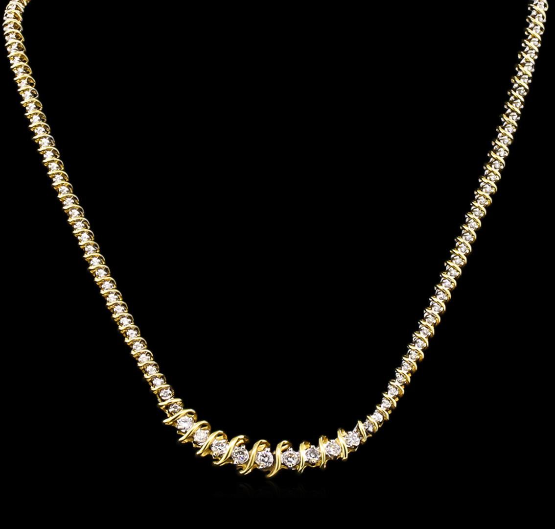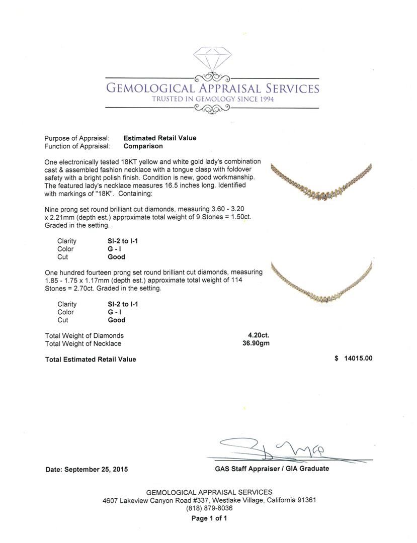 One electronically tested 18KT yellow and white gold lady's combination cast & assembled fashion necklace with a tongue clasp with foldover safety with a bright polish finish. The featured lady's necklace measures 16.5 inches long. Identified with markings of "18K". Condition is new, good workmanship. Containing: Nine prong set round brilliant cut diamonds, measuring 3.60 - 3.20 x 2.21mm (depth est.) approximate total weight of 9 Stones = 1.50ct. Graded in the setting. Clarity: SI-2 to I-1. Color: G - I. Cut Good One Hundred Fourteen prong set round brilliant cut diamonds, measuring 1.85 - 1.75 x 1.17mm (depth est.) approximate total weight of 114 Stones = 2.70ct. Graded in the setting. Clarity: SI-2 to I-1. Color: G - I. Cut Good. Total Weight of Diamonds 4.20ct. Total Weight of Necklace 36.90gm at $14015.00.. GAS Appraised at $14,015.00.