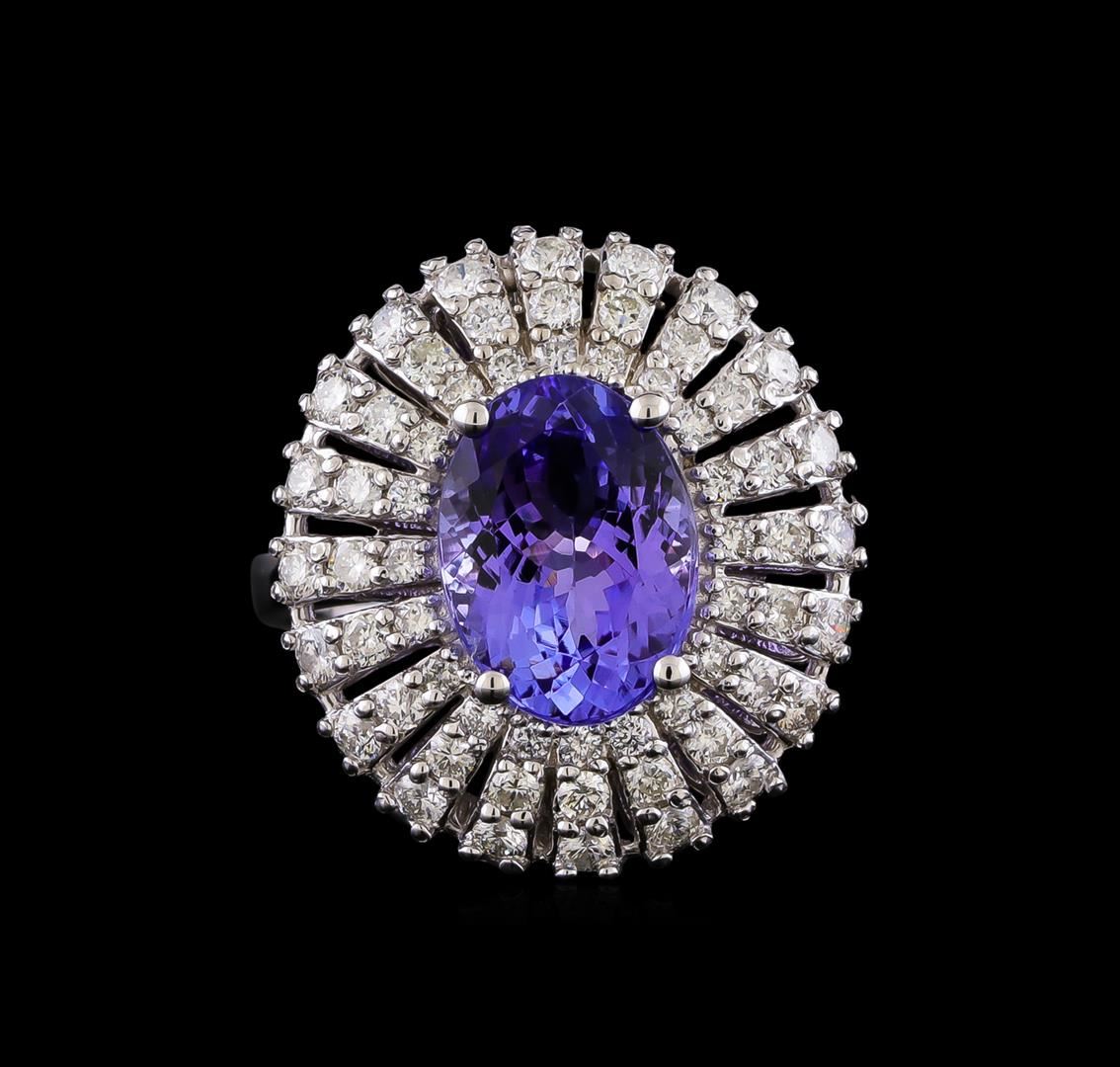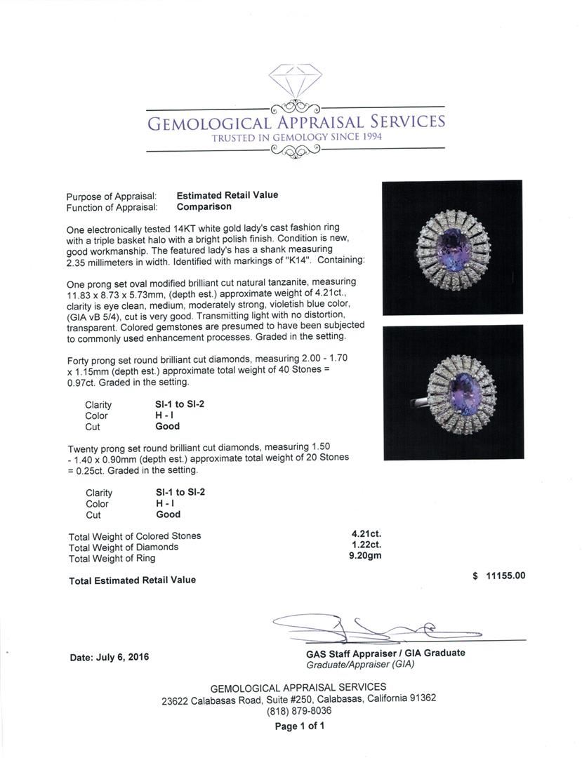 One electronically tested 14KT white gold lady's cast fashion ring with a triple basket halo with a bright polish finish. The featured lady's has a shank measuring 2.35 millimeters in width. Identified with markings of "K14". Condition is new, good workmanship. Containing: One prong set oval modified brilliant cut natural tanzanite, measuring 11.83 x 8.73 x 5.73mm, (depth est.) approximate weight of 4.21ct., clarity is eye clean, medium, moderately strong, violetish blue color, (GIA vB 5/4), cut is very good. Transmitting light with no distortion, transparent. Colored gemstones are presumed to have been subjected to commonly used enhancement processes. Graded in the setting. Forty prong set round brilliant cut diamonds, measuring 2.00 - 1.70 x 1.15mm (depth est.) approximate total weight of 40 Stones = 0.97ct. Graded in the setting. Clarity: SI-1 to SI-2. Color: H - I. Cut Good Twenty prong set round brilliant cut diamonds, measuring 1.50 - 1.40 x 0.90mm (depth est.) approximate total weight of 20 Stones = 0.25ct. Graded in the setting. Clarity: SI-1 to SI-2. Color: H - I. Cut Good. Total Weight of Colored Stones 4.21ct. Total Weight of Diamonds 1.22ct. Total Weight of Ring 9.20gm. GAS Appraised.