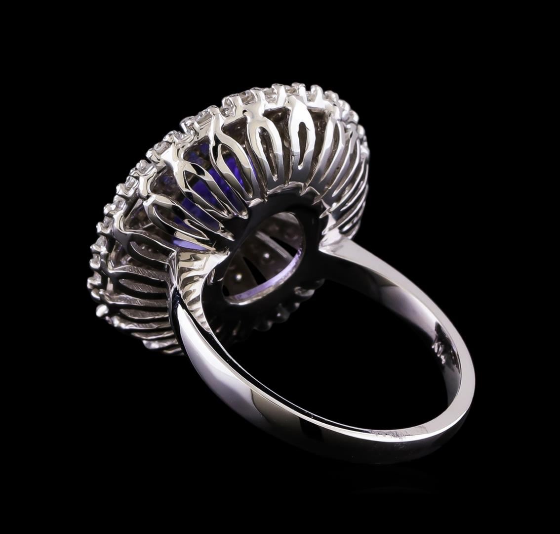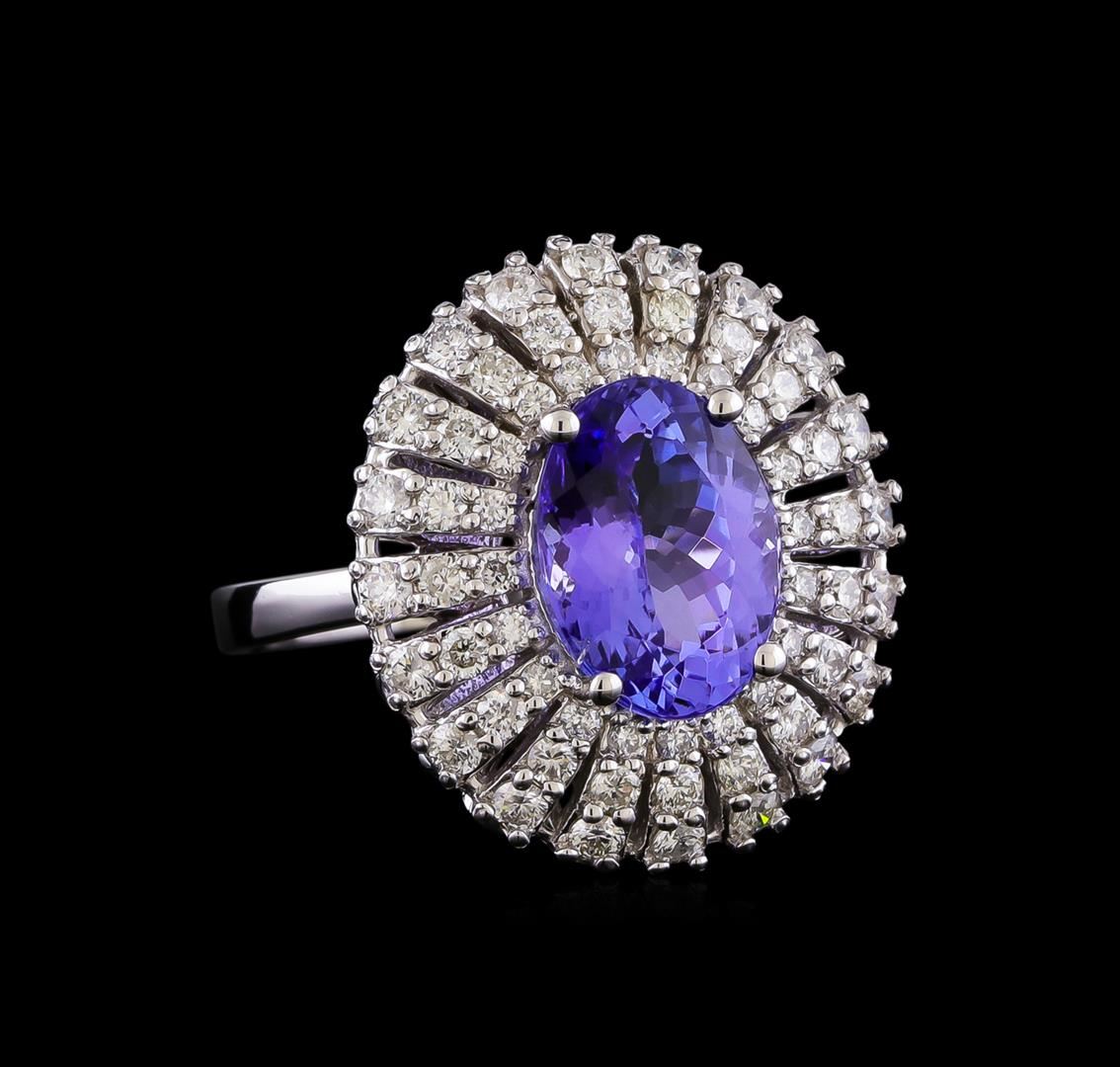 One electronically tested 14KT white gold lady's cast fashion ring with a triple basket halo with a bright polish finish. The featured lady's has a shank measuring 2.35 millimeters in width. Identified with markings of "K14". Condition is new, good workmanship. Containing: One prong set oval modified brilliant cut natural tanzanite, measuring 11.83 x 8.73 x 5.73mm, (depth est.) approximate weight of 4.21ct., clarity is eye clean, medium, moderately strong, violetish blue color, (GIA vB 5/4), cut is very good. Transmitting light with no distortion, transparent. Colored gemstones are presumed to have been subjected to commonly used enhancement processes. Graded in the setting. Forty prong set round brilliant cut diamonds, measuring 2.00 - 1.70 x 1.15mm (depth est.) approximate total weight of 40 Stones = 0.97ct. Graded in the setting. Clarity: SI-1 to SI-2. Color: H - I. Cut Good Twenty prong set round brilliant cut diamonds, measuring 1.50 - 1.40 x 0.90mm (depth est.) approximate total weight of 20 Stones = 0.25ct. Graded in the setting. Clarity: SI-1 to SI-2. Color: H - I. Cut Good. Total Weight of Colored Stones 4.21ct. Total Weight of Diamonds 1.22ct. Total Weight of Ring 9.20gm. GAS Appraised.