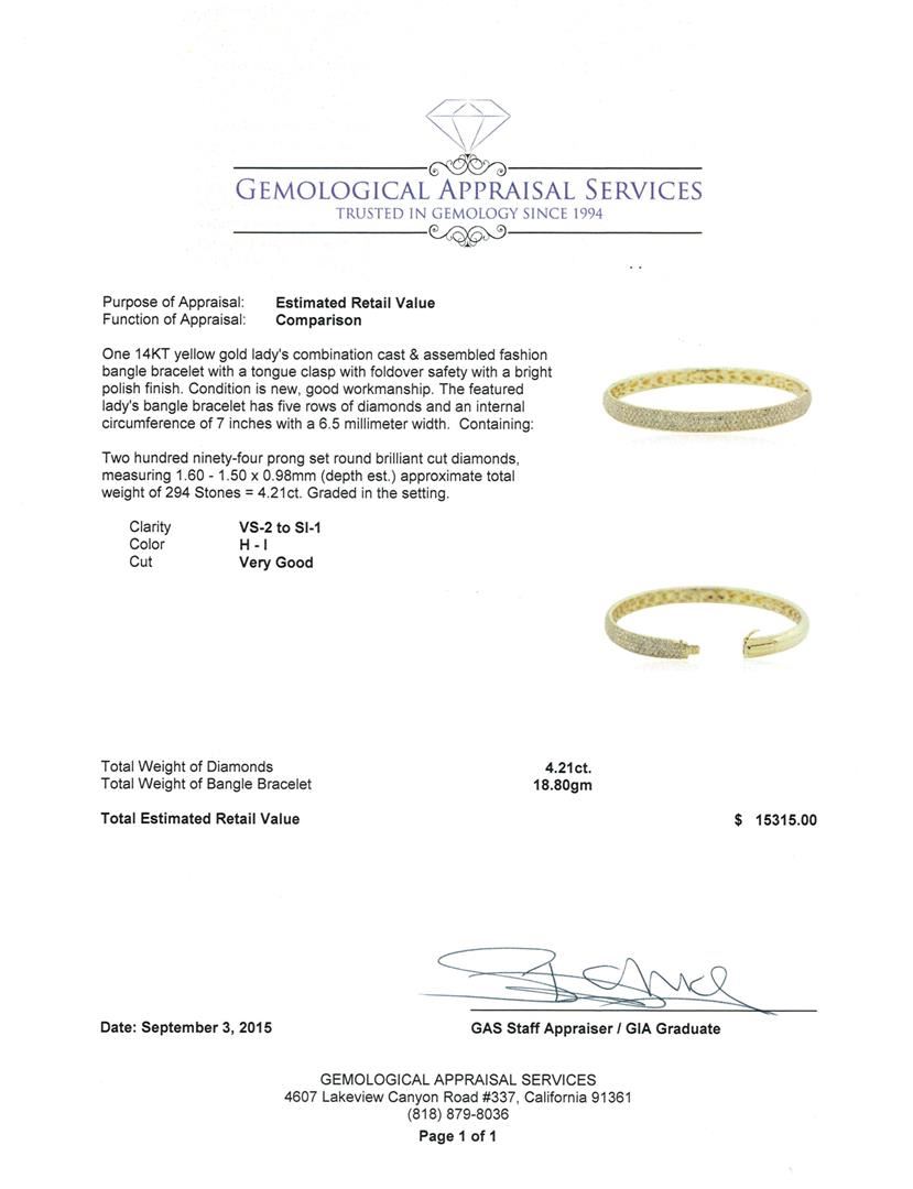 One 14KT yellow gold lady's combination cast & assembled fashion bangle bracelet with a tongue clasp with foldover safety with a bright polish finish. The featured lady's bangle bracelet has five rows of diamonds and an internal circumference of 7 inches with a 6.5 millimeter width. Condition is new, good workmanship. Containing: Two Hundred Ninety-Four prong set round brilliant cut diamonds, measuring 1.60 - 1.50 x 0.98mm (depth est.) approximate total weight of 294 Stones = 4.21ct. Graded in the setting. Clarity: VS-2 to SI-1. Color: H - I. Cut Very Good. Total Weight of Diamonds 4.21ct. Total Weight of Bangle Bracelet 18.80gm. GAS Appraised at $15,315.00.