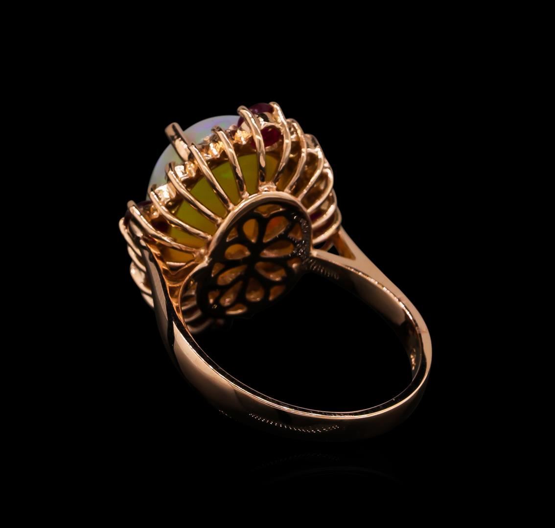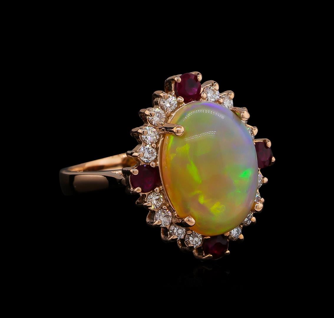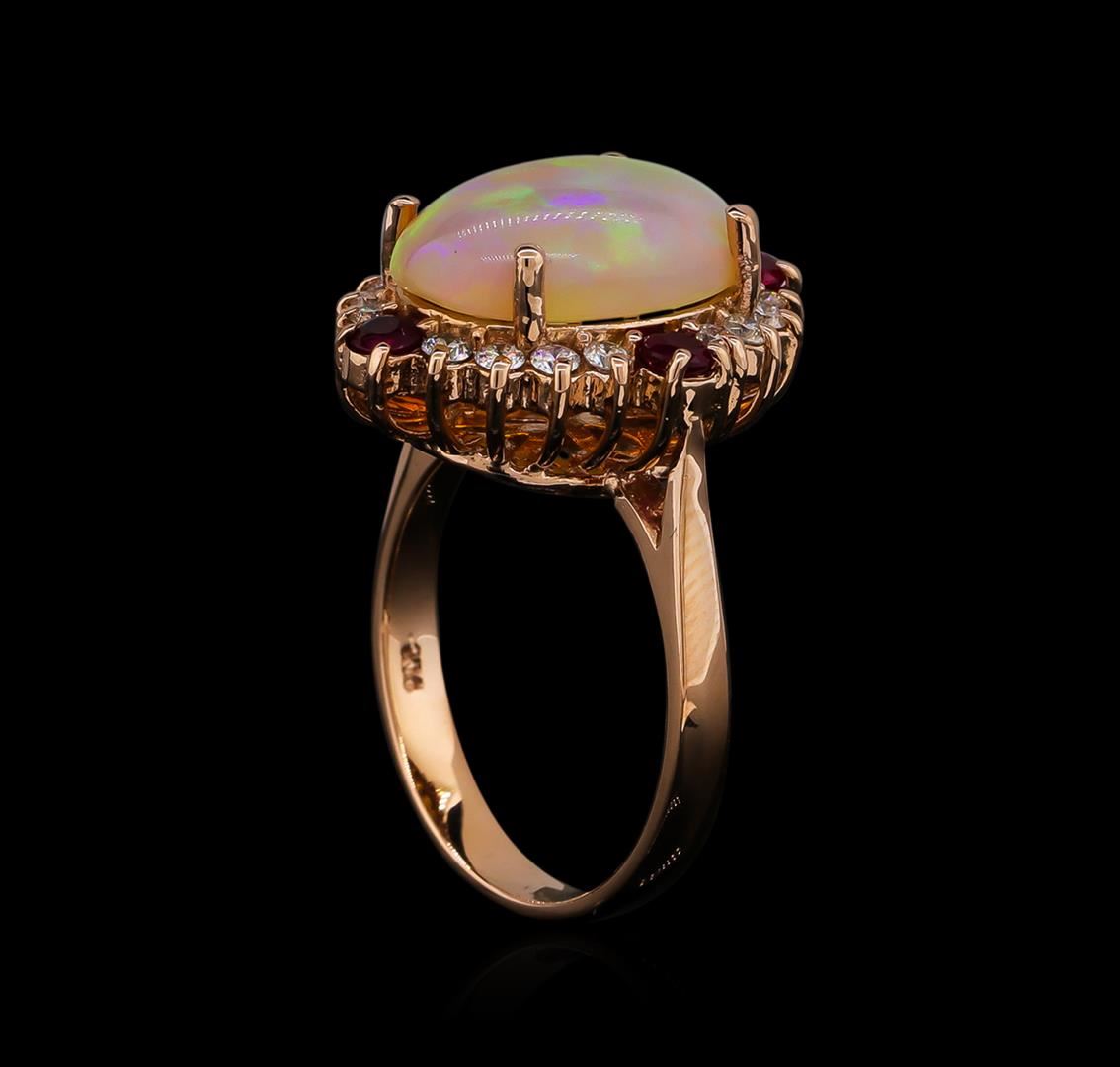One ring featuring: 14KT rose gold weighing 5.68 grams containing one opal with a total weight of 3.71ct and four rubies with a total weight of 0.50ct and side diamonds with a total weight of 0.40ct.