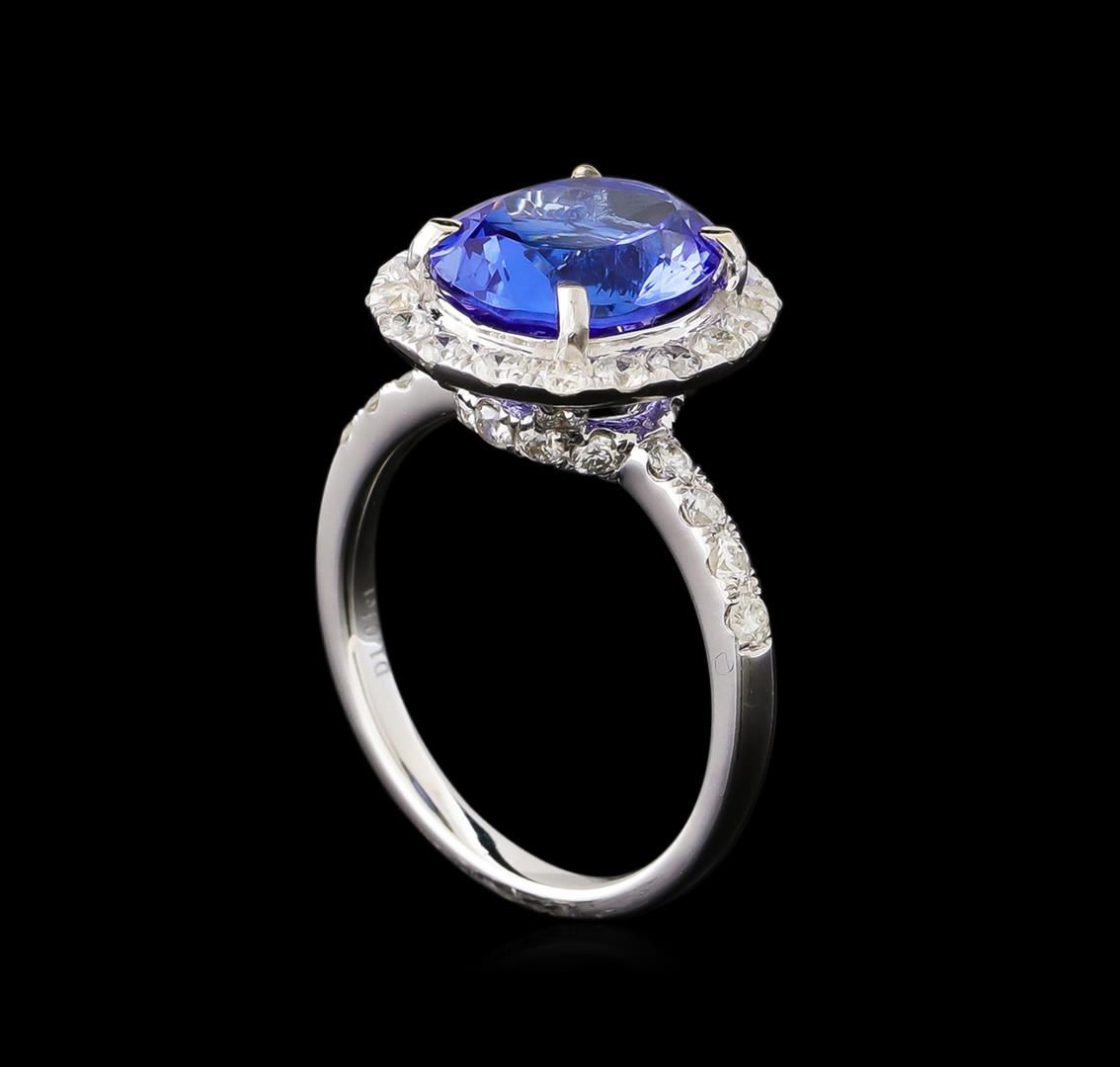 One electronically tested 14KT white gold ladies cast tanzanite and diamond ring with a bright polish finish. The featured tanzanite is set within a diamond bezel supported by a diamond set under gallery supported by diamond set shoulders, completed by a two millimeter wide band. Trademark is Orianne. Identified with markings of "14K". Condition is new, good workmanship. Containing: One prong set oval mixed cut natural tanzanite, measuring 11.35 x 9.20 x 5.42mm, 6%. bulge factor, approximate weight of 4.22ct., clarity is eye clean, type I, medium dark, very slightly grayish, bluish violet color, (GIA bV 6/3), cut is good. Transmitting light with no distortion, transparent. Graded in the setting. Tanzanite is a very rare gemstone that is only found in the country of Tanzania. Originally discovered in 1967. Tiffany & Company, named the stone Tanzanite. It is found in the Usumburu Mountains that border the Umba Valley of northern Tanzania. Tanzanite occurs in gray, brown, violet, blue, reddish-purple, & green. The gem is interesting because of its exceptional pleochroism. Rotated in different directions a tanzanite will exhibit multiple changes of color. Tanzanite has a low tolerance to ultrasonic cleaning, and should not be cleaned using this method. Forty prong set round brilliant cut diamonds, measuring 2.00 - 1.80 x 1.14mm (depth est.) approximate total weight of 40 Stones = 1.10ct. Graded in the setting. Clarity: I-1 to I-2. Color: G - I. Total Weight of Colored Stones 4.22ct. Total Weight of Diamonds 1.10ct. Total Weight of Ring 4.74gm. AIG Appraised at $12,235.00.