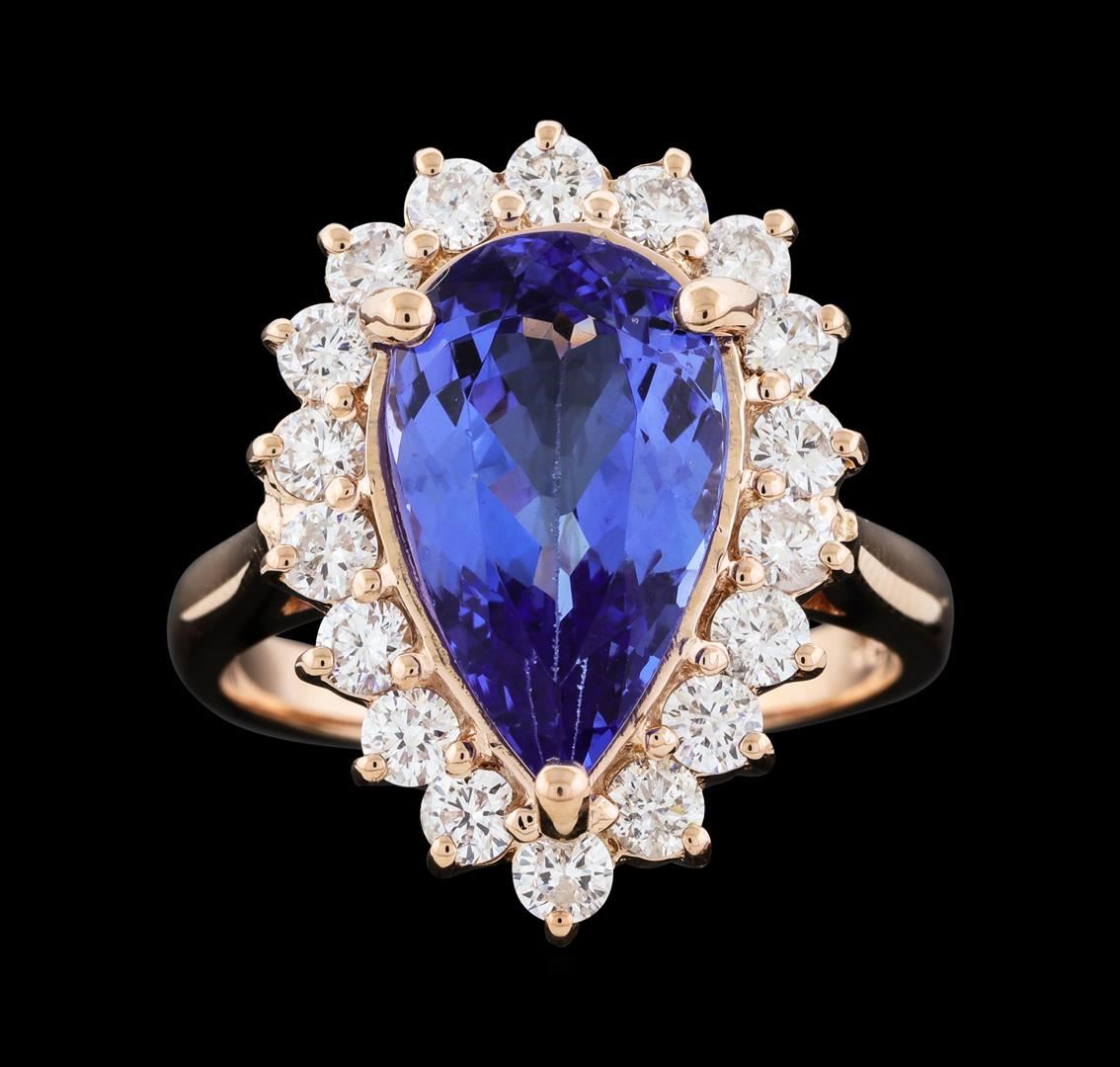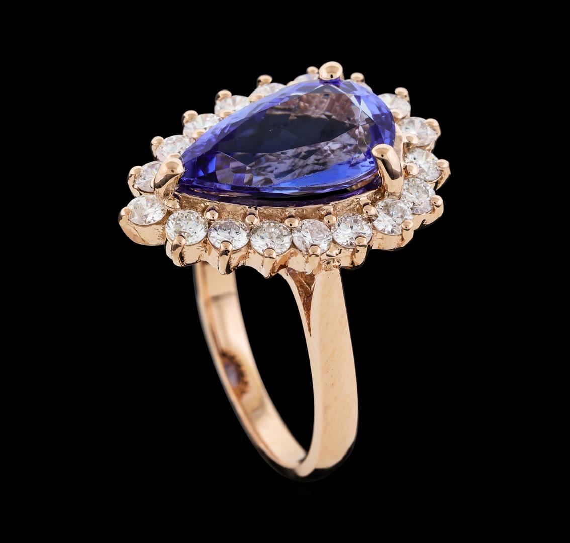 One electronically tested 14KT rose gold lady's cast fashion ring with a cathedral shank with a basket halo with a bright polish finish. The featured lady's ring has a shank measuring 2.14 millimeters wide. Identified with markings of 'K14'. Condition is new, good workmanship. Containing: One prong set pear modified brilliant cut natural tanzanite, measuring 13.85 x 8.32 x 5.28mm, (depth est.) approximate weight of 4.23ct., clarity is eye clean, medium, moderately strong, violetish blue color, (GIA vB 5/4), cut is very good. Transmitting light with no distortion, transparent. Colored gemstones are presumed to have been subjected to commonly used enhancement processes. Graded in the setting. Eighteen prong set round brilliant cut diamonds, measuring 2.50 - 2.40 x 1.49mm (depth est.) approximate total weight of 18 Stones = 0.98ct. Graded in the setting. Clarity SI-1 to I-1. Color: G - H Cut Good. Total Weight of Colored Stones 4.23ct.. Total Weight of Diamonds 0.98ct.. Total Weight of Ring 6.50gm. GAS Appraised at $9,855.00.