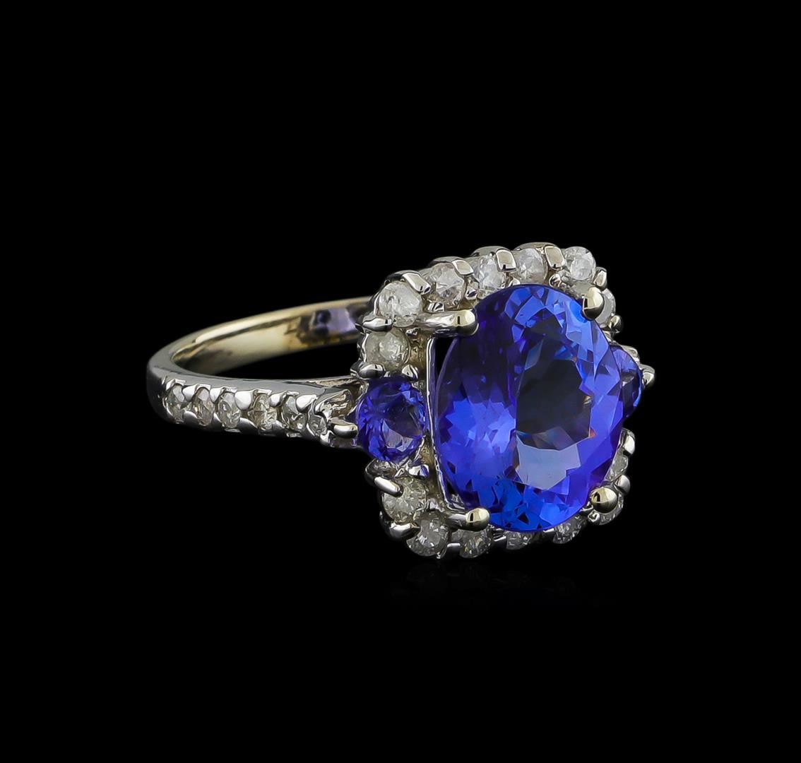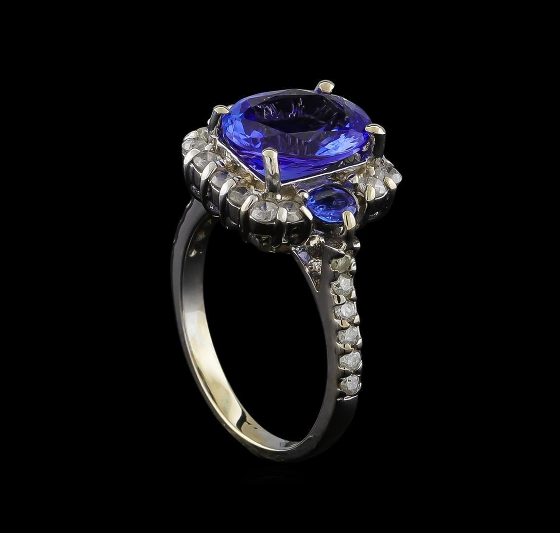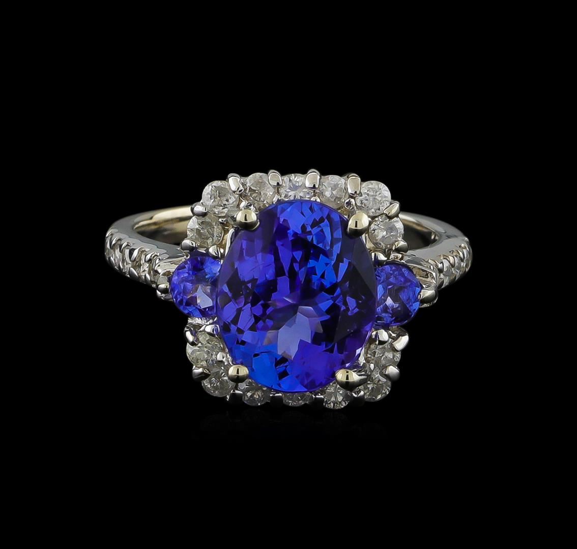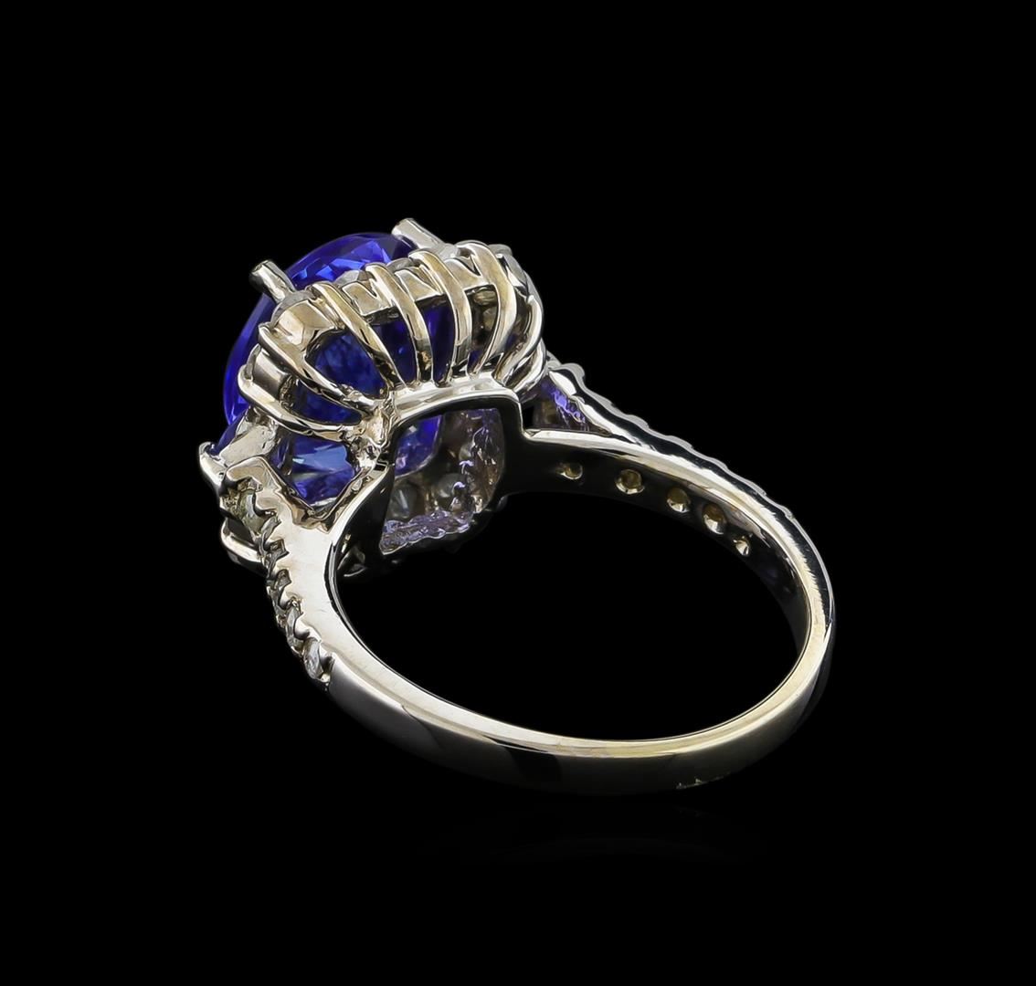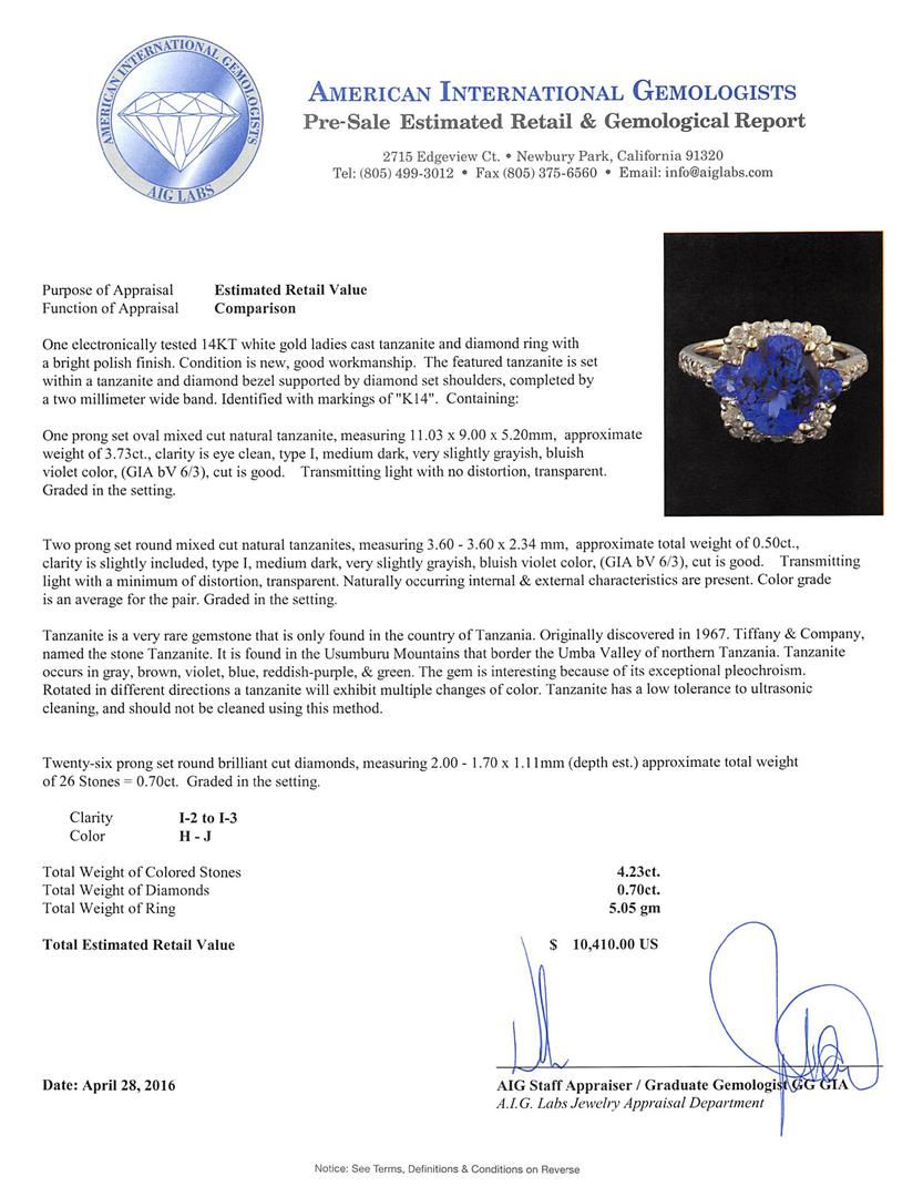 One electronically tested 14KT white gold ladies cast tanzanite and diamond ring with a bright polish finish. The featured tanzanite is set within a tanzanite and diamond bezel supported by diamond set shoulders, completed by a two millimeter wide band. Identified with markings of "K14". Condition is new, good workmanship. Containing: One prong set oval mixed cut natural tanzanite, measuring 11.03 x 9.00 x 5.20mm, approximate weight of 3.73ct., clarity is eye clean, type I, medium dark, very slightly grayish, bluish violet color, (GIA bV 6/3), cut is good. Transmitting light with no distortion, transparent. Graded in the setting. Two prong set round mixed cut natural tanzanites, measuring 3.60 - 3.60 x 2.34 mm, approximate total weight of 0.50ct., clarity is slightly included, type I, medium dark, very slightly grayish, bluish violet color, (GIA bV 6/3), cut is good. Transmitting light with a minimum of distortion, transparent. Naturally occurring internal & external characteristics are present. Color grade is an average for the pair. Graded in the setting. Tanzanite is a very rare gemstone that is only found in the country of Tanzania. Originally discovered in 1967. Tiffany & Company, named the stone Tanzanite. It is found in the Usumburu Mountains that border the Umba Valley of northern Tanzania. Tanzanite occurs in gray, brown, violet, blue, reddish-purple, & green. The gem is interesting because of its exceptional pleochroism. Rotated in different directions a tanzanite will exhibit multiple changes of color. Tanzanite has a low tolerance to ultrasonic cleaning, and should not be cleaned using this method. Twenty-Six prong set round brilliant cut diamonds, measuring 2.00 - 1.70 x 1.11mm (depth est.) approximate total weight of 26 Stones = 0.70ct. Graded in the setting. Clarity: I-2 to I-3. Color: H - J. Total Weight of Colored Stones 4.23ct. Total Weight of Diamonds 0.70ct. Total Weight of Ring 5.05gm. AIG Appraised at $10,410.00.