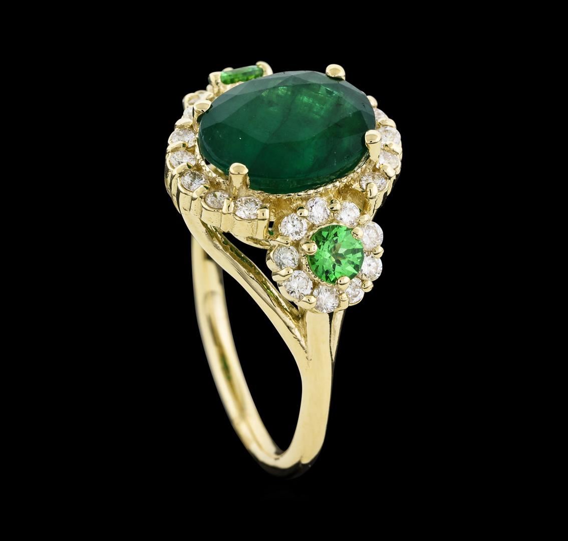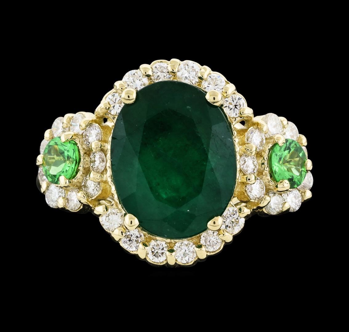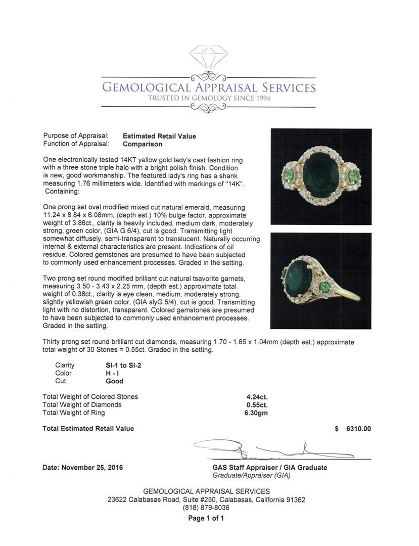 One electronically tested 14KT yellow gold lady's cast fashion ring with a three stone triple halo with a bright polish finish. The featured lady's ring has a shank measuring 1.76 millimeters wide. Identified with markings of '14K'. Condition is new, good workmanship. Containing: One prong set oval modified mixed cut natural emerald, measuring 11.24 x 8.84 x 6.08mm, (depth est.) 10%. bulge factor, approximate weight of 3.86ct., clarity is heavily included, medium dark, moderately strong, green color, (GIA G 6/4), cut is good. Transmitting light somewhat diffusely, semi-transparent to translucent. Naturally occurring internal & external characteristics are present. Indications of oil residue. Colored gemstones are presumed to have been subjected to commonly used enhancement processes. Graded in the setting. Two prong set round modified brilliant cut natural tsavorite garnets, measuring 3.50 - 3.43 x 2.25 mm, (depth est.) approximate total weight of 0.38ct., clarity is eye clean, medium, moderately strong, slightly yellowish green color, (GIA slyG 5/4), cut is good. Transmitting light with no distortion, transparent. Colored gemstones are presumed to have been subjected to commonly used enhancement processes. Graded in the setting. Thirty prong set round brilliant cut diamonds, measuring 1.70 - 1.65 x 1.04mm (depth est.) approximate total weight of 30 Stones = 0.55ct. Graded in the setting. Clarity SI-1 to SI-2. Color: H - I Cut Good. Total Weight of Colored Stones 4.24ct.. Total Weight of Diamonds 0.55ct.. Total Weight of Ring 6.30gm. GAS Appraised at $6,310.00.