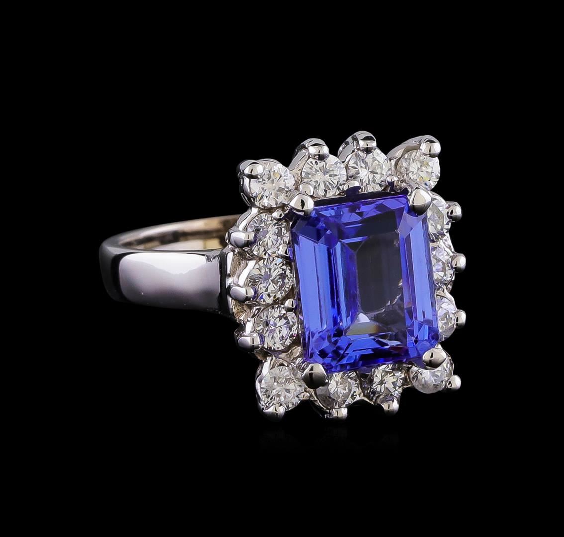 One electronically tested 14KT white gold lady's cast fashion ring with a basket halo with a bright polish finish. The featured lady's has a shank measuring 2.85 millimeters in width. Identified with markings of "14K". Condition is new, good workmanship. Containing: One prong set emerald step cut natural tanzanite, measuring 9.27 x 8.08 x 5.57mm, (depth est.) 12%. bulge factor, approximate weight of 4.24ct., clarity is eye clean, medium light, moderately strong, violetish blue color, (GIA vB 4/4), cut is very good. Transmitting light with no distortion, transparent. Colored gemstones are presumed to have been subjected to commonly used enhancement processes. Graded in the setting. Fourteen prong set round brilliant cut diamonds, measuring 2.60 - 2.55 x 1.61mm (depth est.) approximate total weight of 14 Stones = 0.92ct. Graded in the setting. Clarity: SI-1 to SI-2. Color: H - I. Cut Good. Total Weight of Colored Stones 4.24ct. Total Weight of Diamonds 0.92ct. Total Weight of Ring 6.60gm. GAS Appraised.