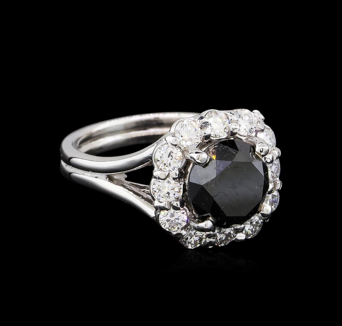 One electronically tested 14KT white gold ladies cast black and white diamond ring with a bright polish finish. The featured black diamond is set within a white diamond bezel supported by split shoulders, completed by a three millimeter wide grooved band. Condition is new, good workmanship. Containing: One prong set round brilliant cut diamond, measuring 8.60 - 8.60 x 6.50mm (depth est.) approximate weight of 3.35ct. Indications of multiple laboratory enhancements. The specific gravity of black diamond is 3.120 to 3.165. Diamond tester results are non reactive. Graded in the setting. Clarity Déclassé‚. Color: Fancy Black; Irradiated. Depth: 75.5%. Table: 66.2%. Twelve prong set round brilliant cut diamonds approximate total weight of 12 Stones = 0.90ct. Graded in the setting. Clarity: SI-1 to SI-2. Color: E - G. Total Weight of Diamonds 4.25ct. Total Weight of Ring 6.94gm. AIG Appraised at $7,295.00.
