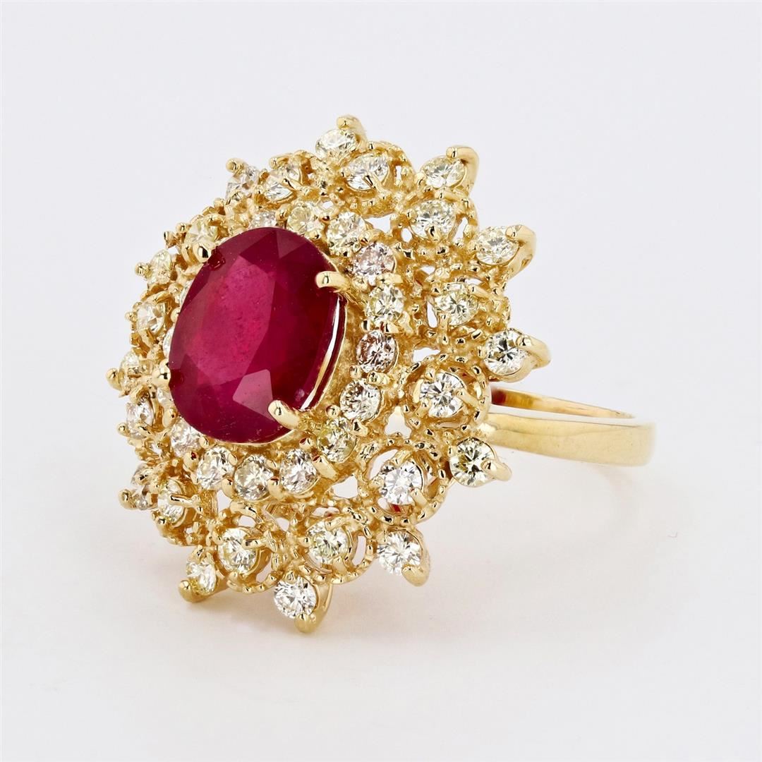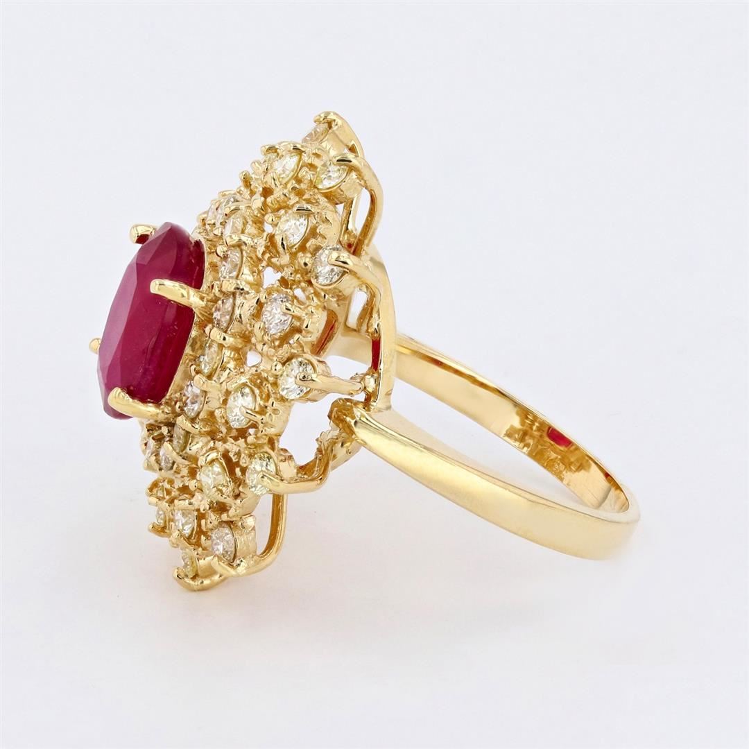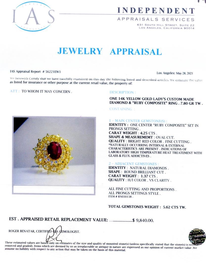 ONE 14K YELLOW GOLD LADY'S CUSTOM MADE DIAMOND & "RUBY COMPOSITE" RING. 7.80 GR TW. CONTAINING: 1 â€" MAIN CENTER GEMSTONE(S): IDENTITY : ONE CENTER "RUBY COMPOSITE" SET IN PRONGS SETTING. CARAT WEIGHT : 4.25 CT. SHAPE & MEASUREMEMT : OVAL CUT. QUALITY : BRIGHT RED COLOR. FINE CUTTING. *NATURALLY OCCURRING INTERNAL & EXTERNAL CHARACTERISTICS ARE PRESENT. INDICATIONS OF LABORATORY HIGH TEMPERATURE HEAT TREATEMENT WITH GLASS & FLUX ADDICTIVES 2 - ADJACENT GEMSTONES: IDENTITY : NATURAL DIAMONDS. SHAPE : ROUND BRILLIANT CUT. CARAT WEIGHT : 1.37 CTW. QUALITY : H/I COLOR , VS CLARITY. ALL FINE CUTTING AND PROPORTIONS. ALL PRONGS SETTINGS STYLE. TOTAL GEMSTONES WEIGHT : 5.62 CT TW.