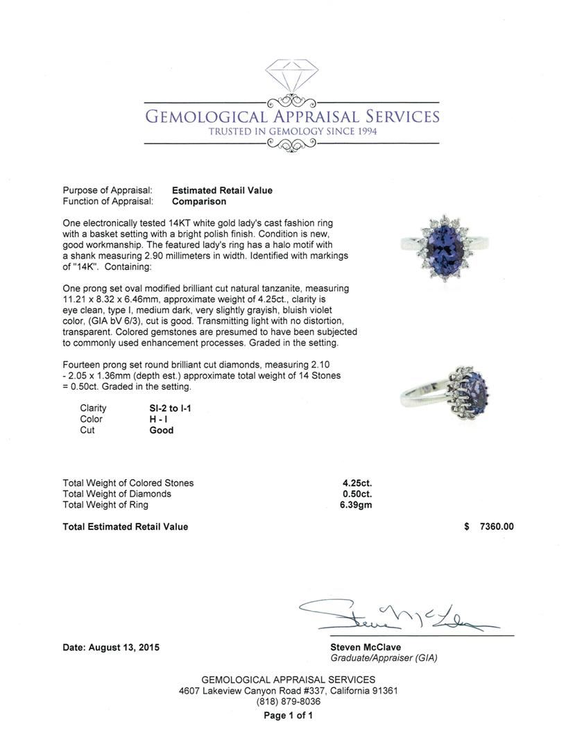One electronically tested 14KT white gold lady's cast fashion ring with a basket setting with a bright polish finish. The featured lady's ring has a halo motif with a shank measuring 2.90 millimeters in width. Identified with markings of "14K". Condition is new, good workmanship. Containing: One prong set oval modified brilliant cut natural tanzanite, measuring 11.21 x 8.32 x 6.46mm, approximate weight of 4.25ct., clarity is eye clean, type I, medium dark, very slightly grayish, bluish violet color, (GIA bV 6/3), cut is good. Transmitting light with no distortion, transparent. Colored gemstones are presumed to have been subjected to commonly used enhancement processes. Graded in the setting. Fourteen prong set round brilliant cut diamonds, measuring 2.10 - 2.05 x 1.36mm (depth est.) approximate total weight of 14 Stones = 0.50ct. Graded in the setting. Clarity: SI-2 to I-1. Color: H - I. Cut Good. Total Weight of Colored Stones 4.25ct. Total Weight of Diamonds 0.50ct. Total Weight of Ring 6.39gm. GAS Appraised at $7,360.00.