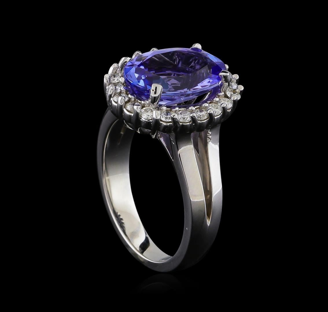 One electronically tested 14KT white gold lady's cast fashion ring with a basket halo with a bright polish finish. The featured lady's ring has a shank measuring 3.17 millimeters wide. Identified with markings of "14K". Condition is new, good workmanship. Containing: One prong set oval modified brilliant cut natural tanzanite, measuring 12.38 x 8.92 x 5.44mm, approximate weight of 4.25ct., clarity is eye clean, type I, medium light, moderately strong, violetish blue color, (GIA vB 4/4), cut is good. Transmitting light with no distortion, transparent. Colored gemstones are presumed to have been subjected to commonly used enhancement processes. Graded in the setting. Twenty prong set round brilliant cut diamonds, measuring 1.90 - 1.85 x 1.17mm (depth est.) approximate total weight of 20 Stones = 0.50ct. Graded in the setting. Clarity: SI-1 to SI-2. Color: G - Good. Total Weight of Colored Stones 4.25ct. Total Weight of Diamonds 0.50ct. Total Weight of Ring 9.30gm. GAS Appraised at $7,645.00.